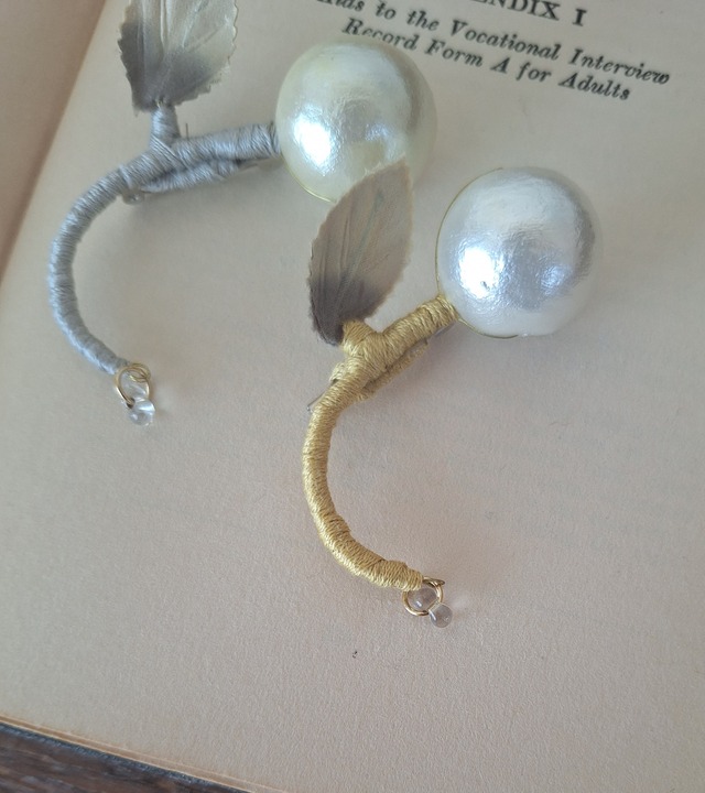 大きめのコットンパールを主役にした、クラシカルで存在感のあるブローチ。 葉っぱのモチーフを添えて、まるで“月の実”が実っているような幻想的な雰囲気に仕上げました。 帽子やバッグ、ジャケットの胸元に合わせるだけで、コーディネートのアクセントに。 シンプルな装いにもナチュラルなスタイルにも馴染み、毎日のコーデに上品な輝きをプラスしてくれます。 — 一点もの — 茎アイスミント □素材□ コットンパール(きなり)、真鍮ワイヤー、刺繍、造花、ガラスビーズ、メタルパーツ、ブローチパーツ □大きさ コットンパール(白)(きなり)2.3cm 全体の長さ 5.5cm程度 □茎 ブルー/やまぶき ※湿気や水濡れにはご注意ください。長時間直射日光に当てないでください