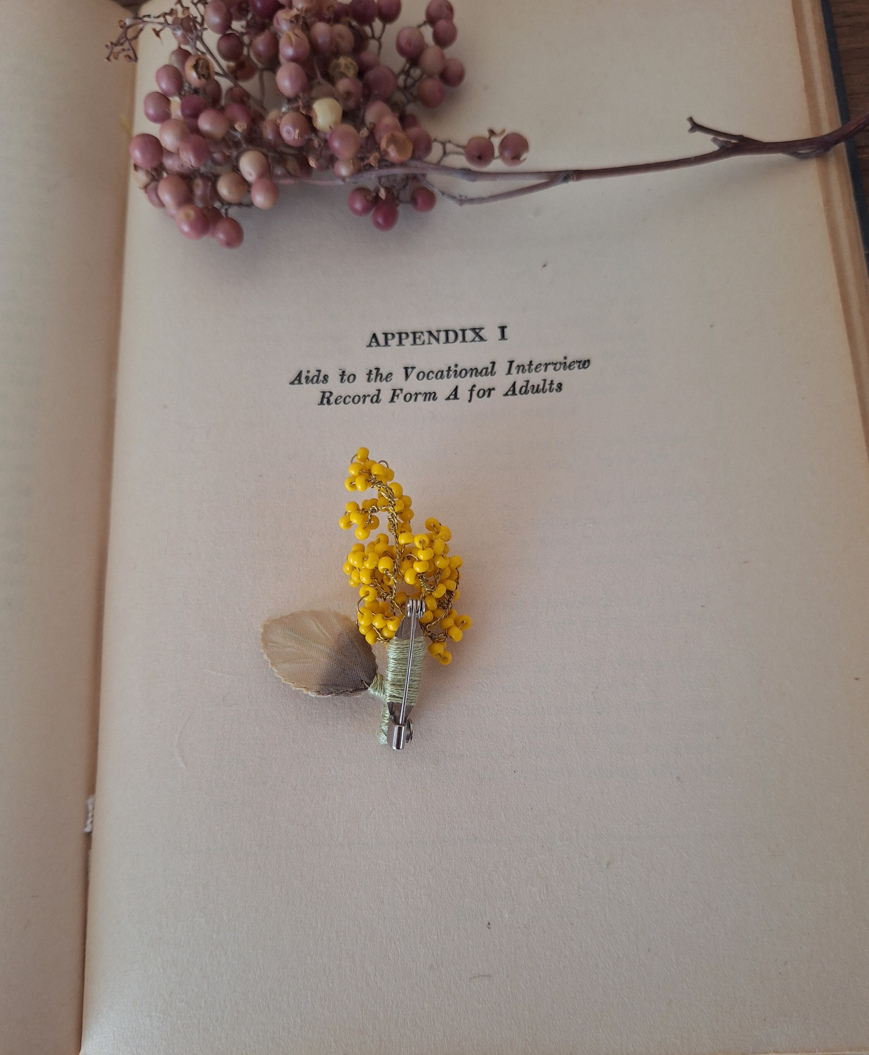ヴィンテージビーズ、真鍮ワイヤー、ブローチピン、刺繍糸
