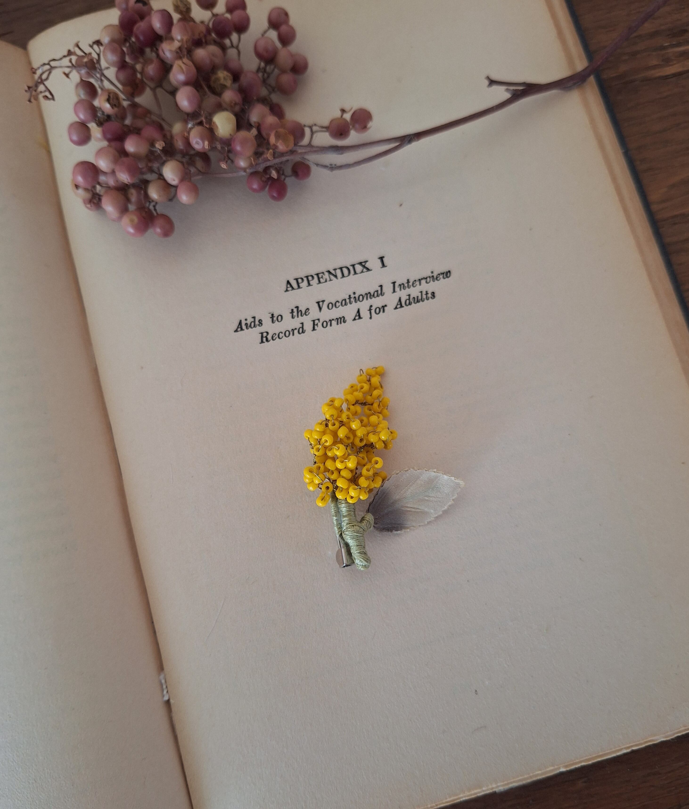 小さな黄色い花粒を、ヴィンテージビーズでひと粒ずつ仕立てました。