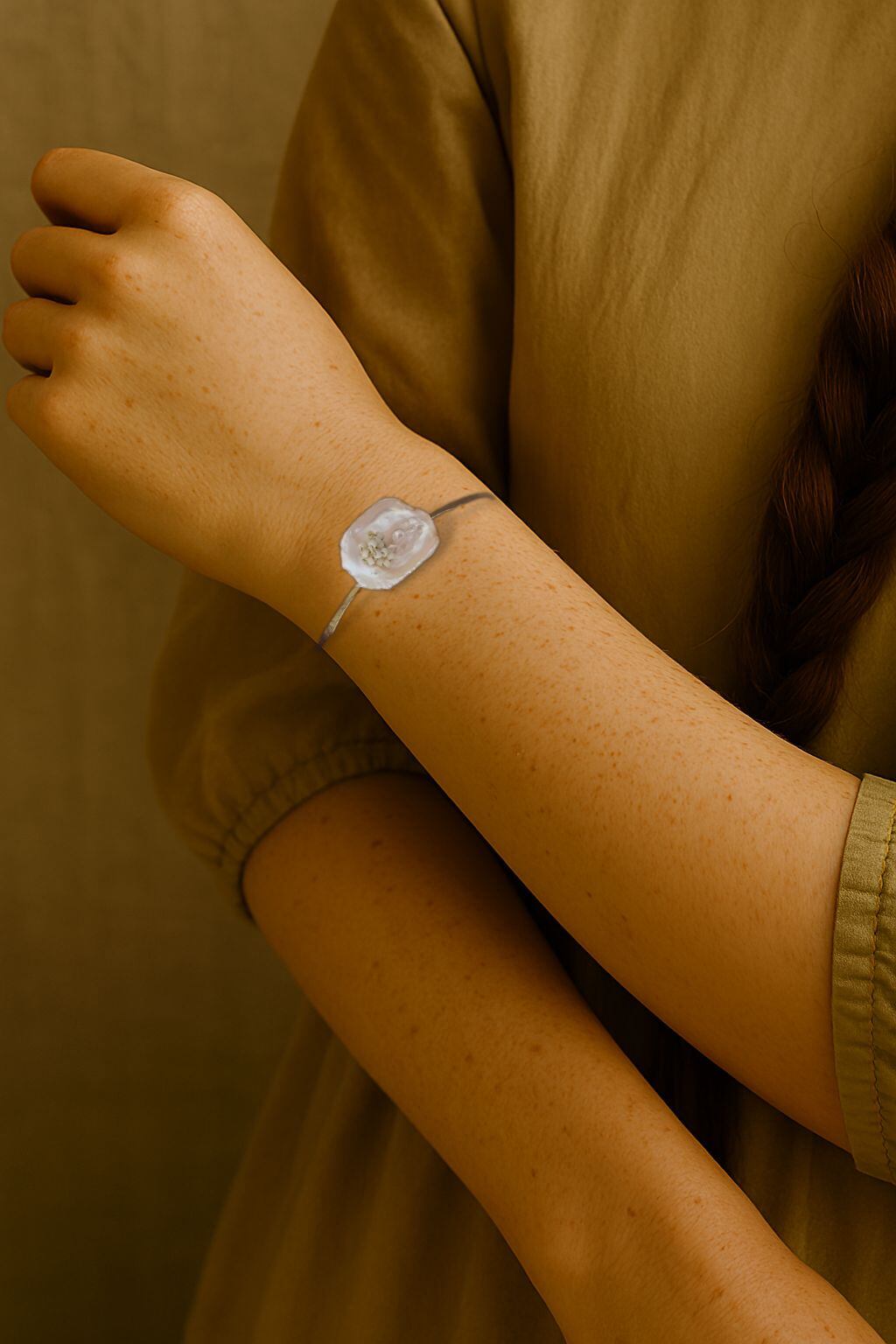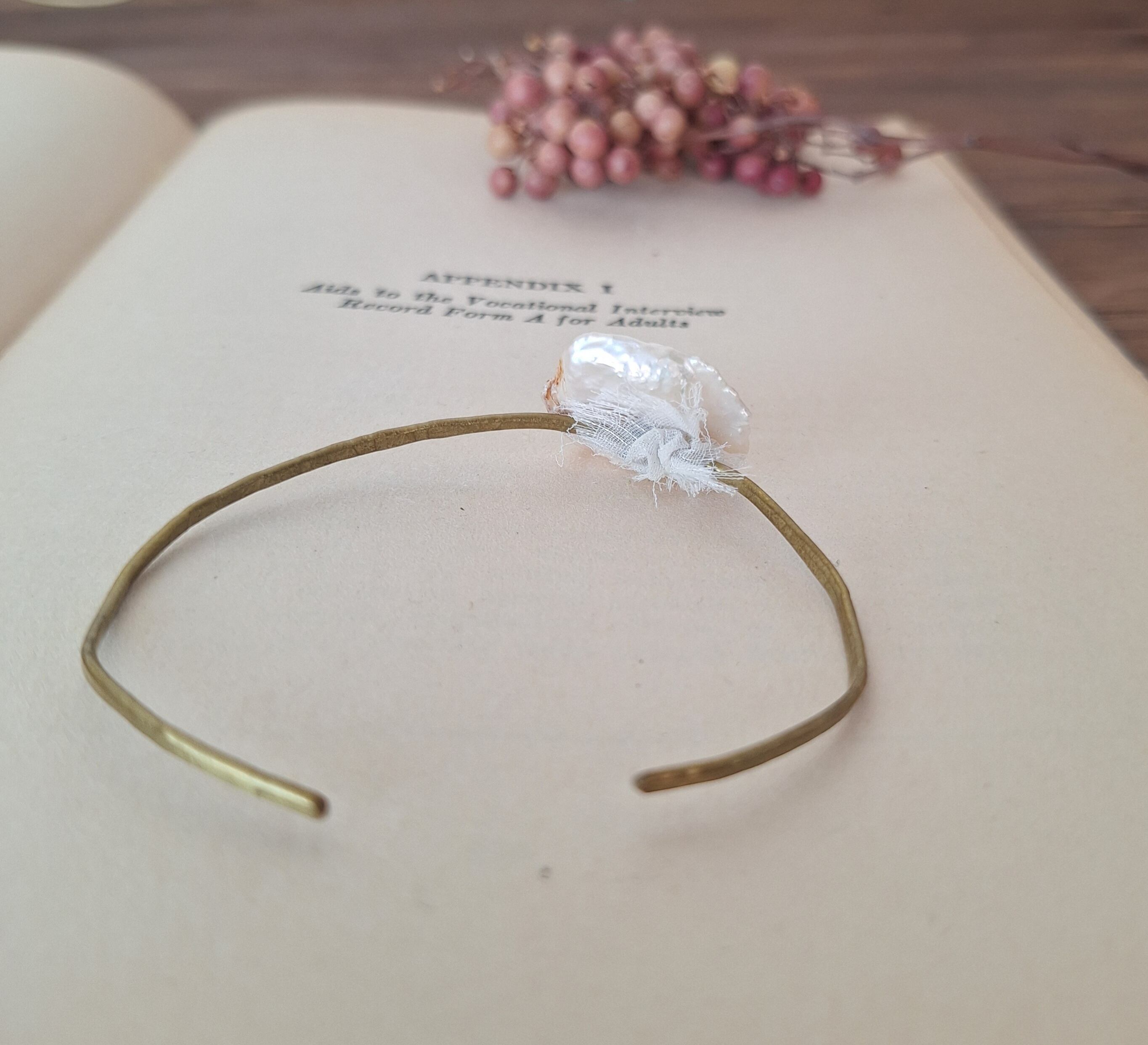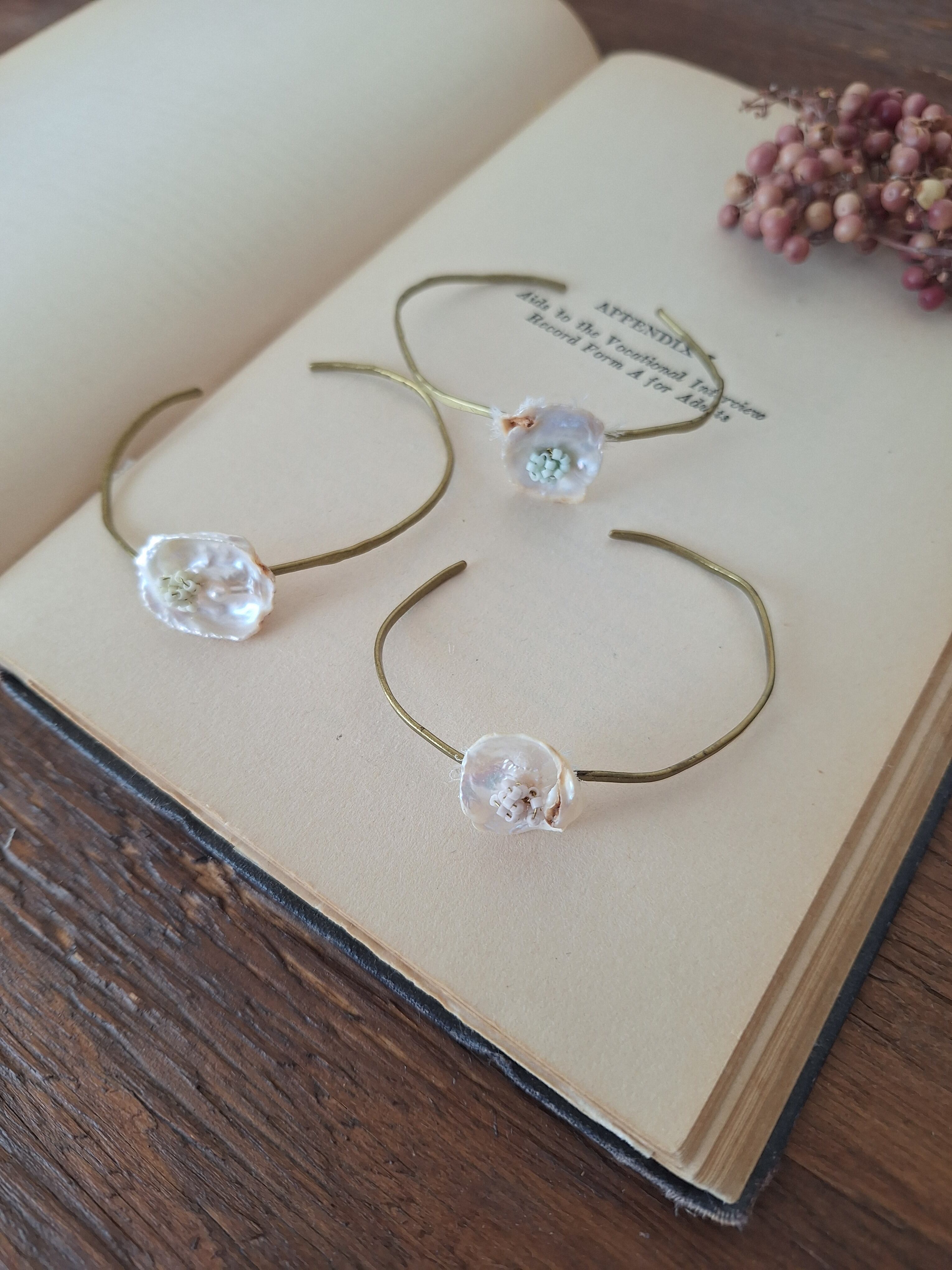 光を受けるたびに淡くきらめき、幻想的な雰囲気を纏わせる特別なバングルです。