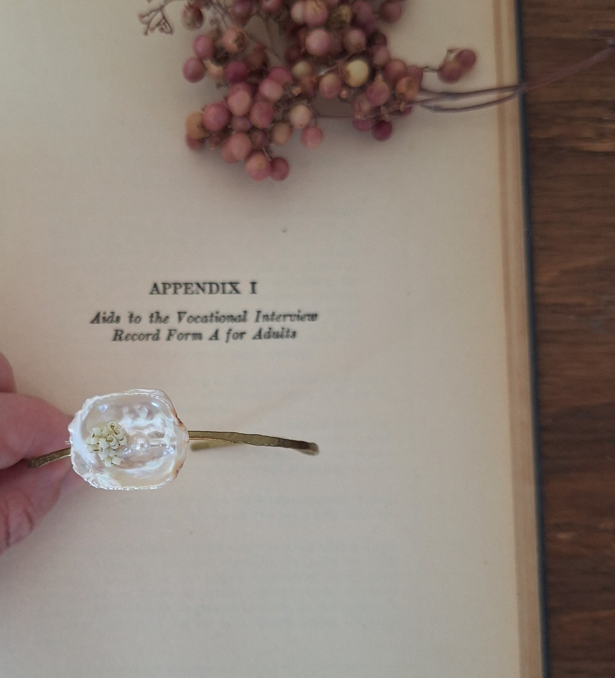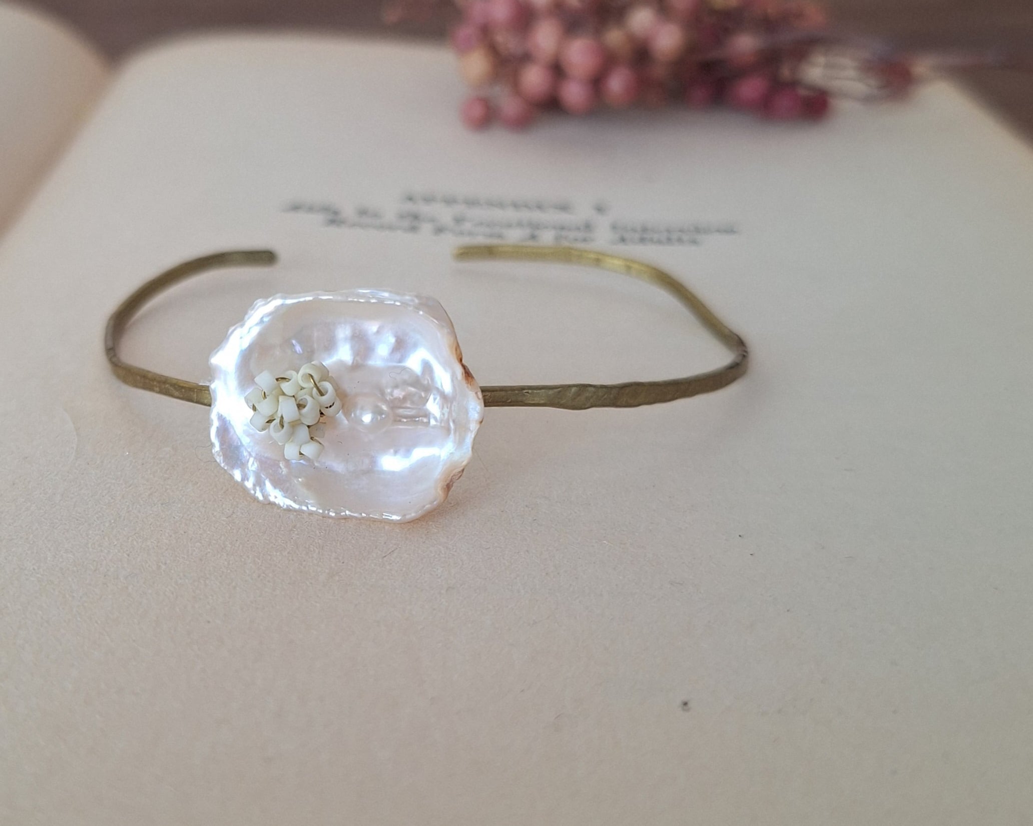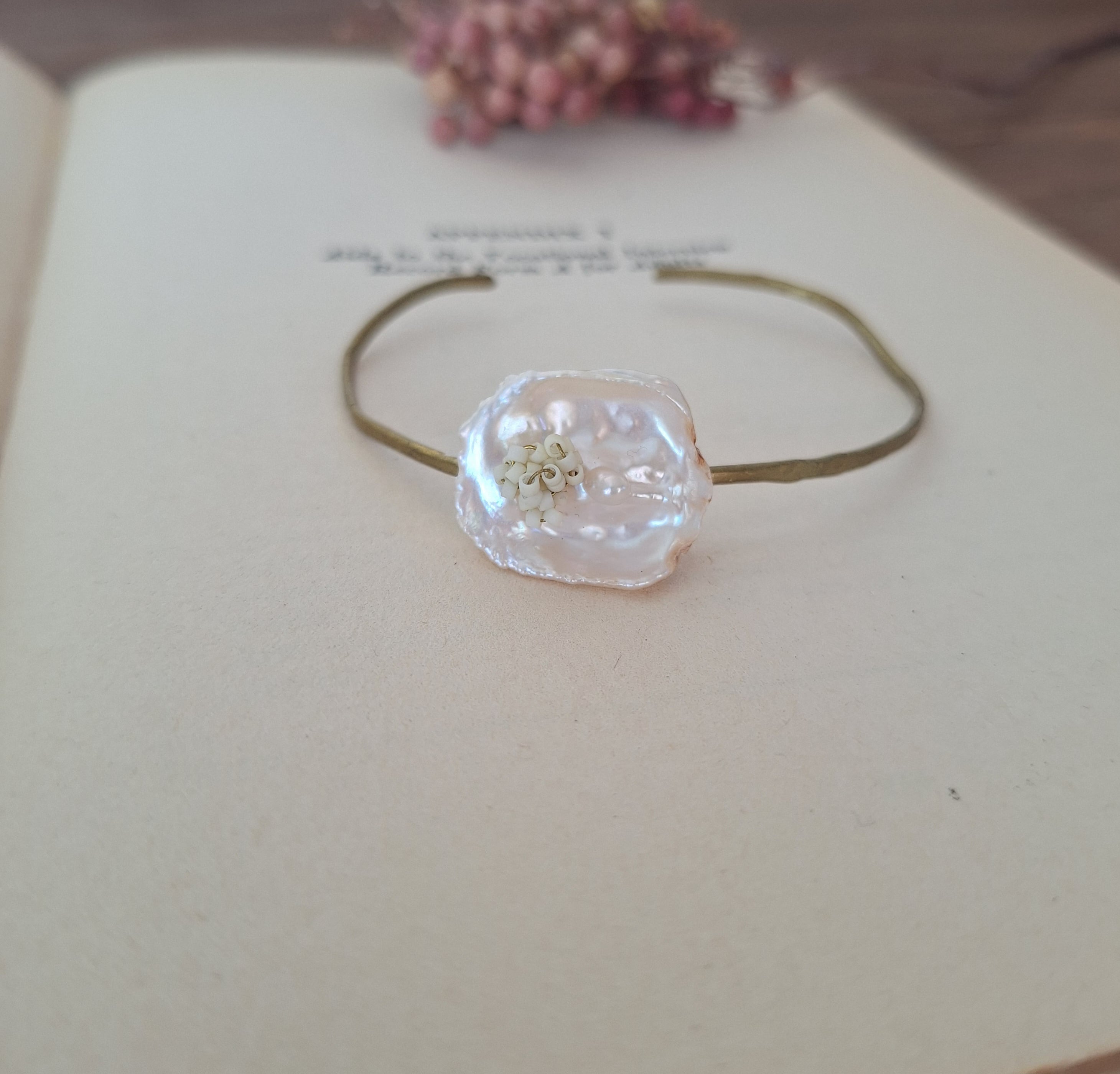 光を受けるたびに淡くきらめき、幻想的な雰囲気を纏わせる特別なバングルです。