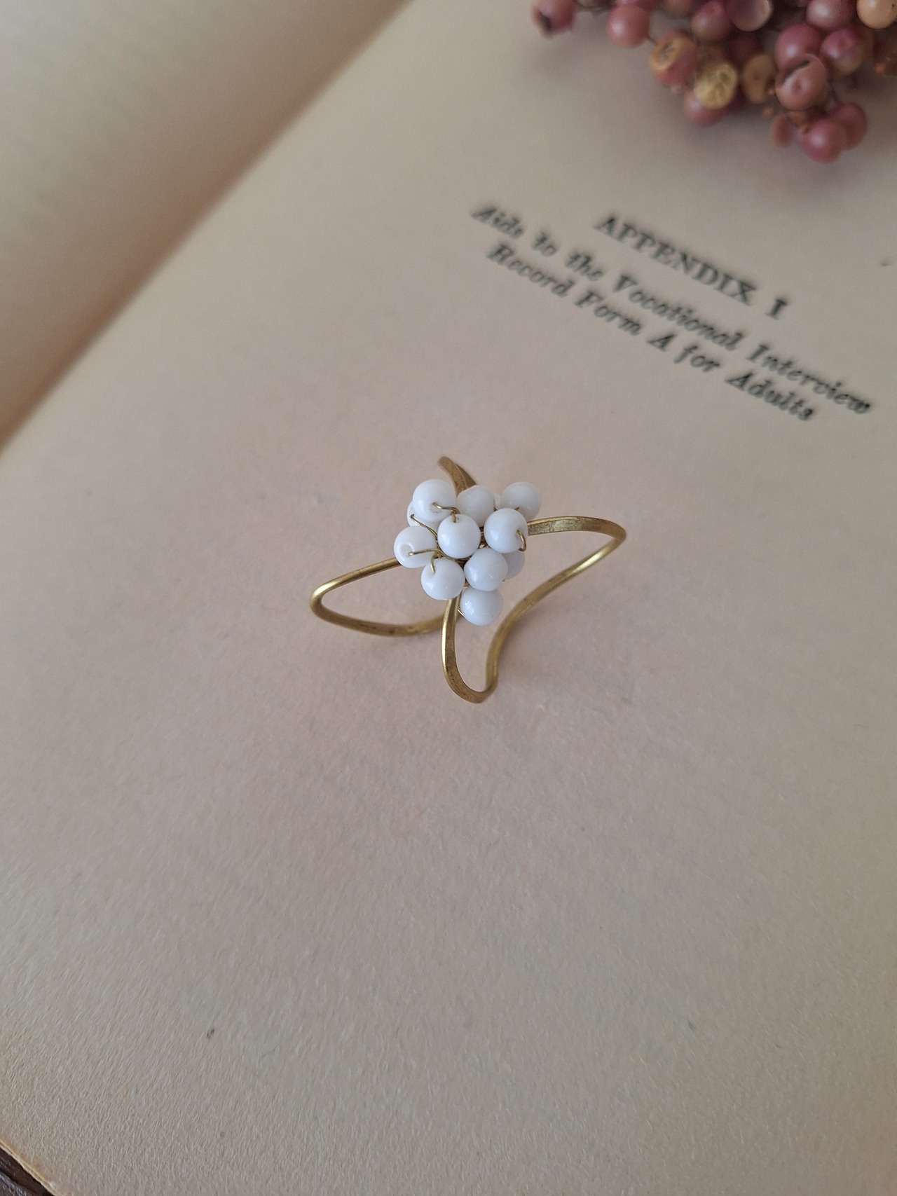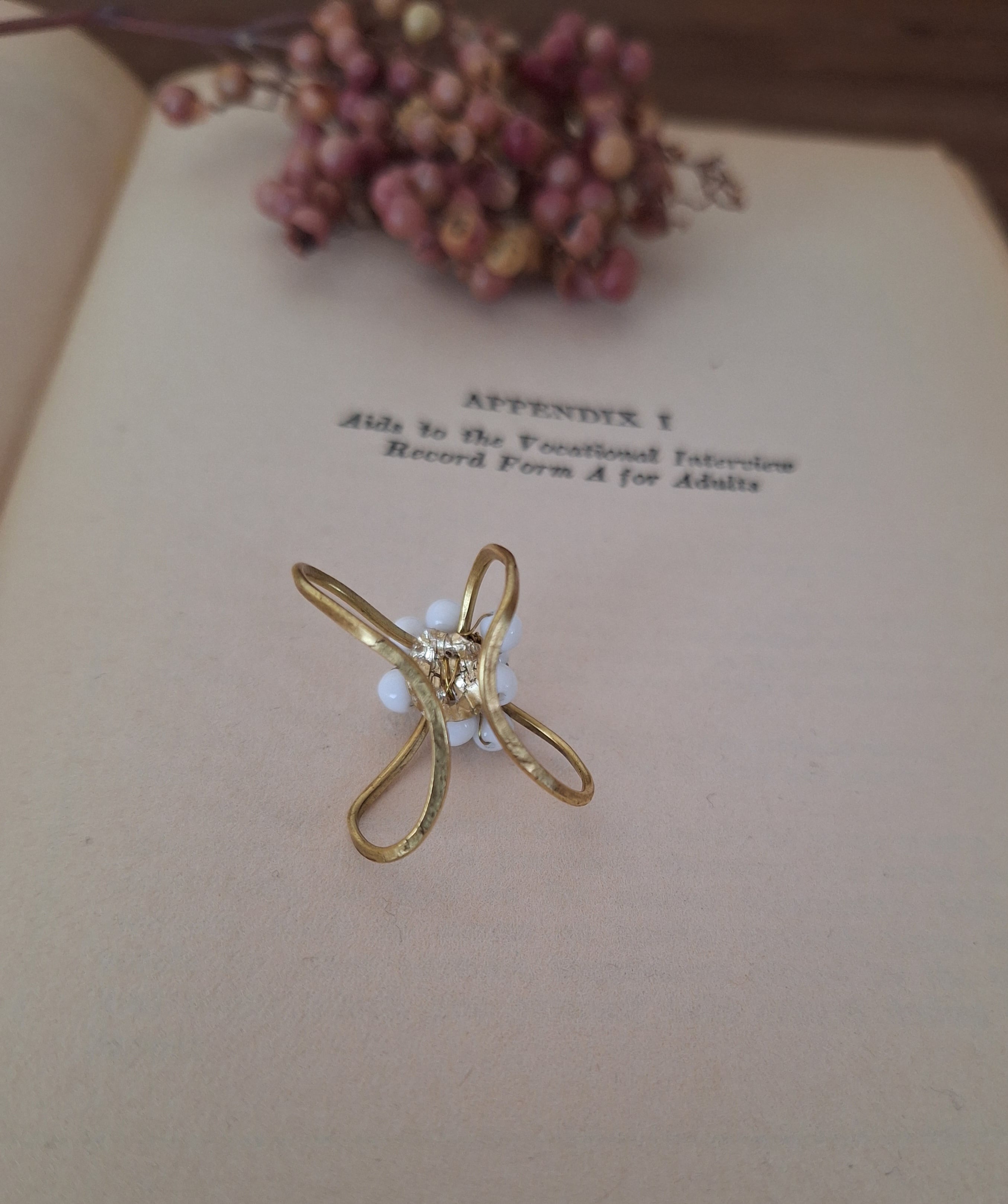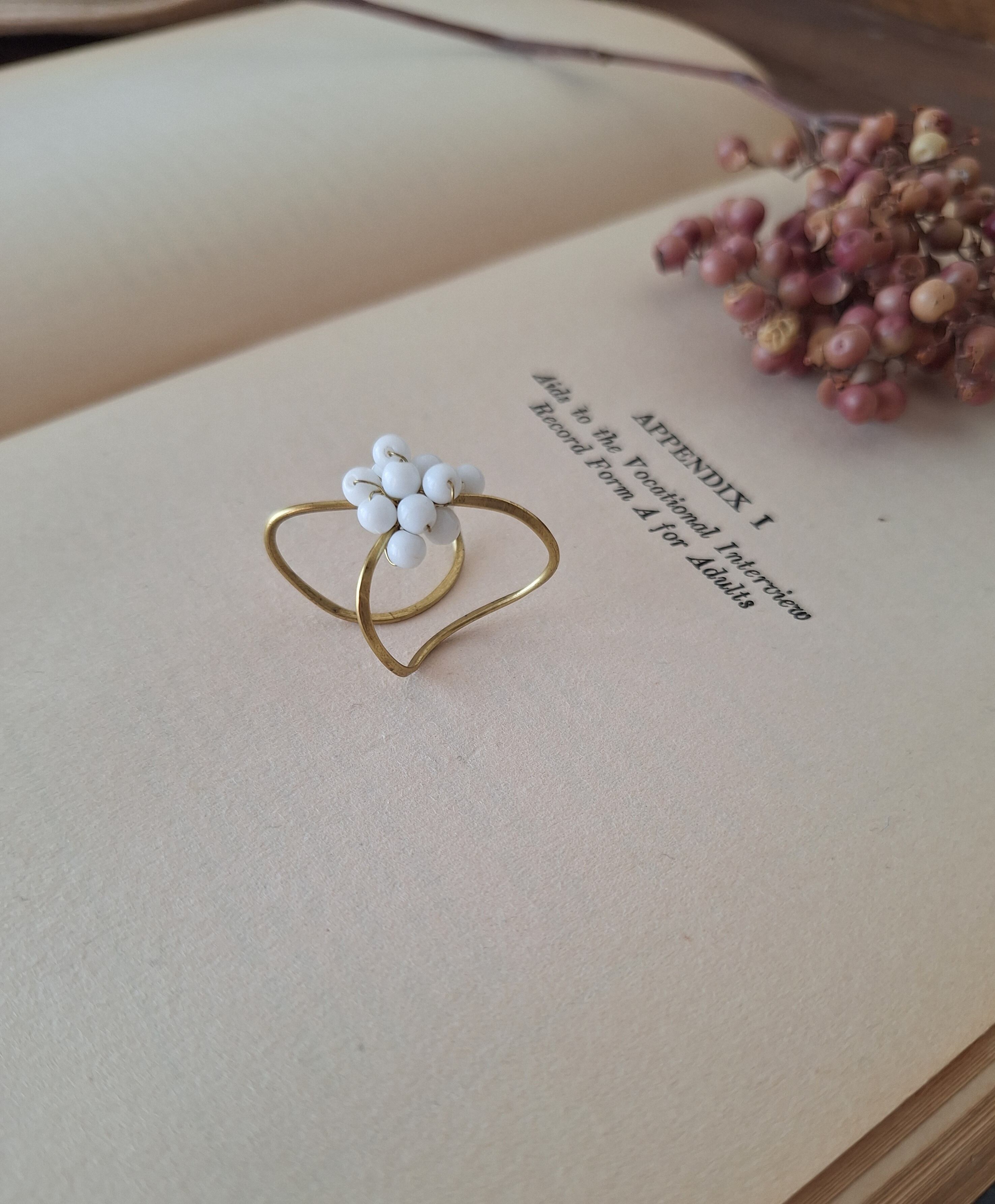 ヴィンテージビーズを真鍮ワイヤーで丁寧に編み込み、真上から見ると星のように輝くデザインに仕上げました。