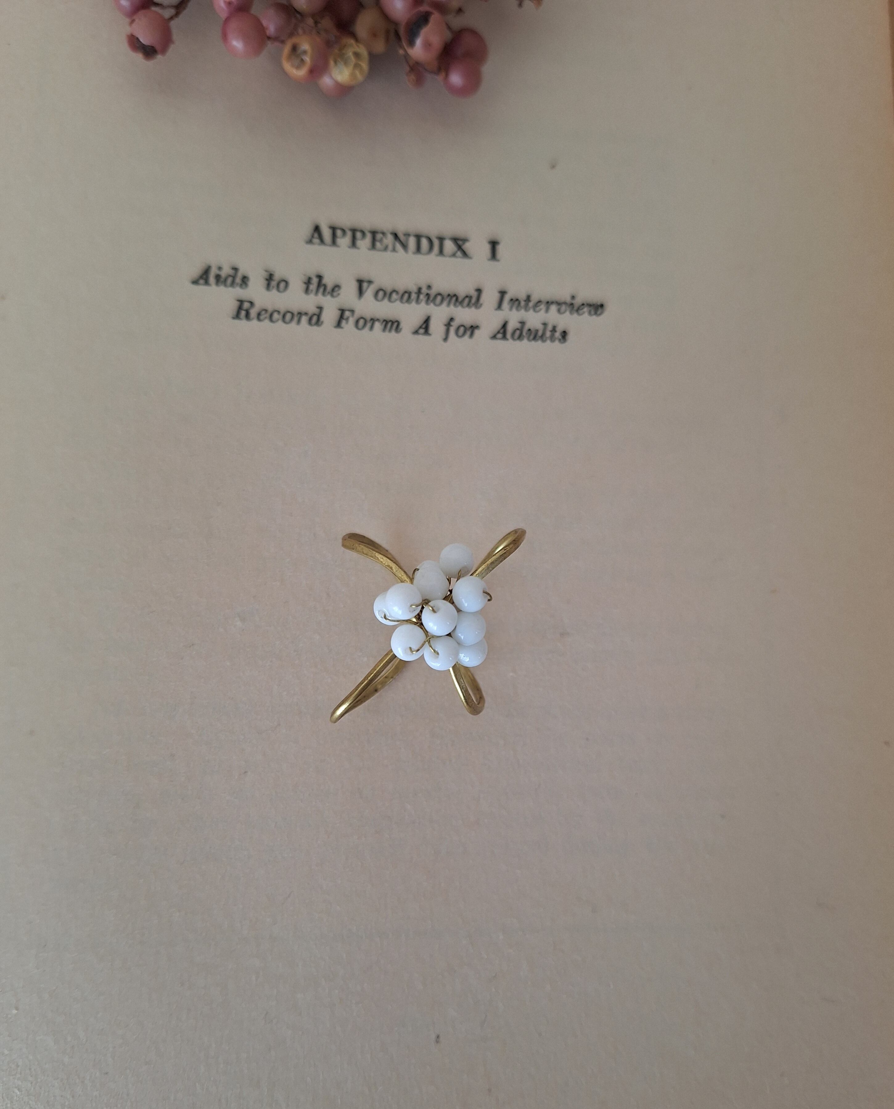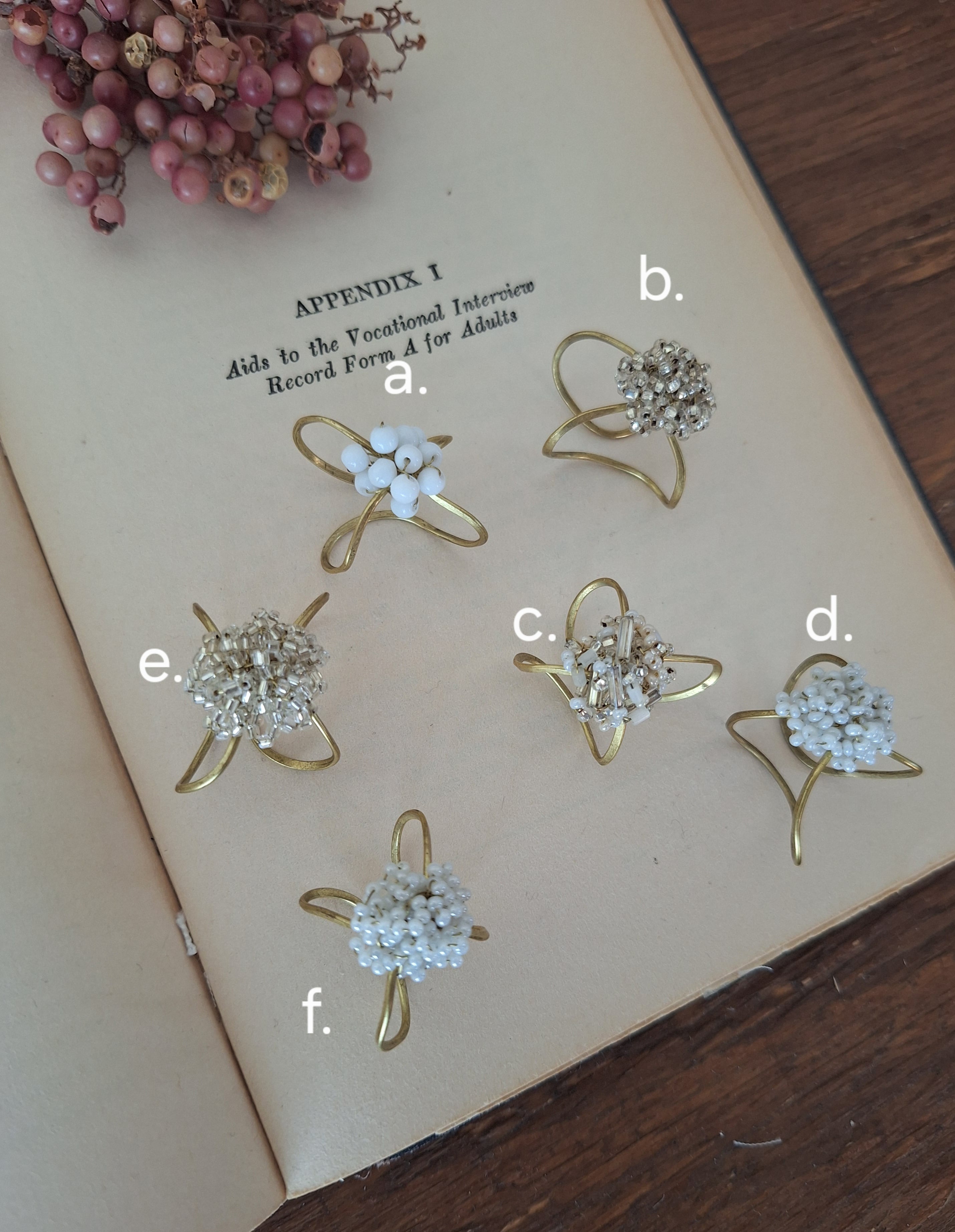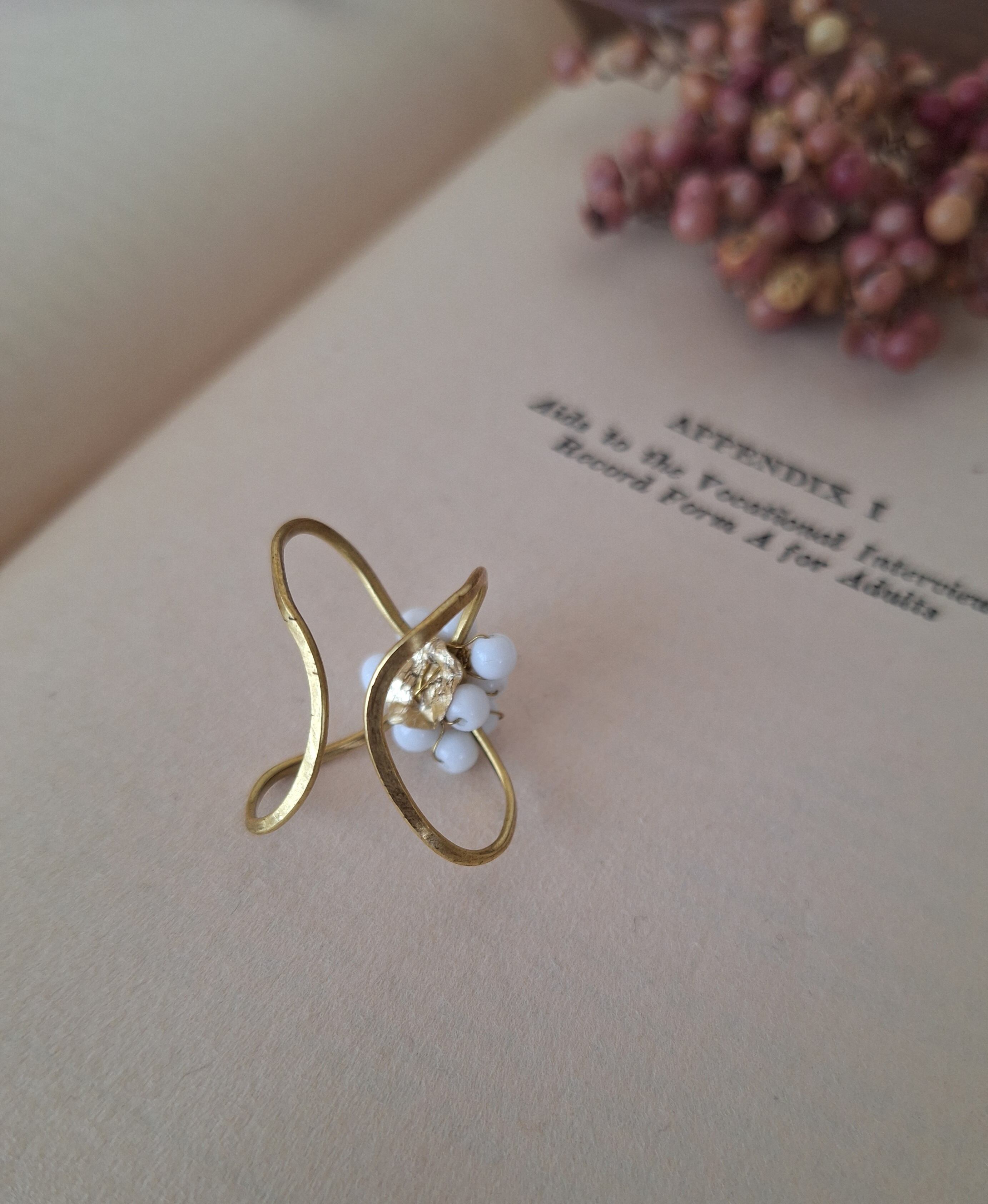 ヴィンテージビーズを真鍮ワイヤーで丁寧に編み込み、真上から見ると星のように輝くデザインに仕上げました。