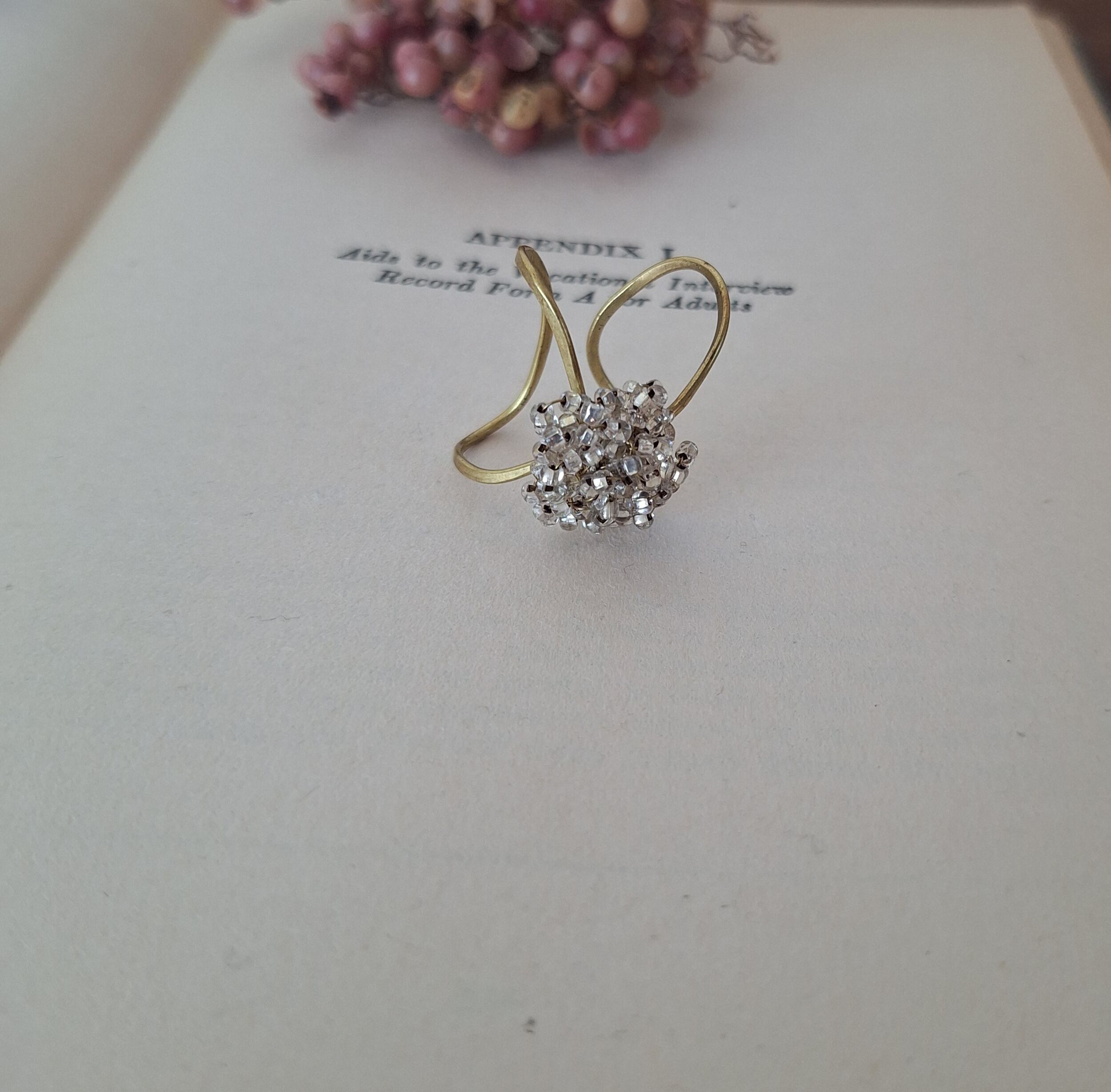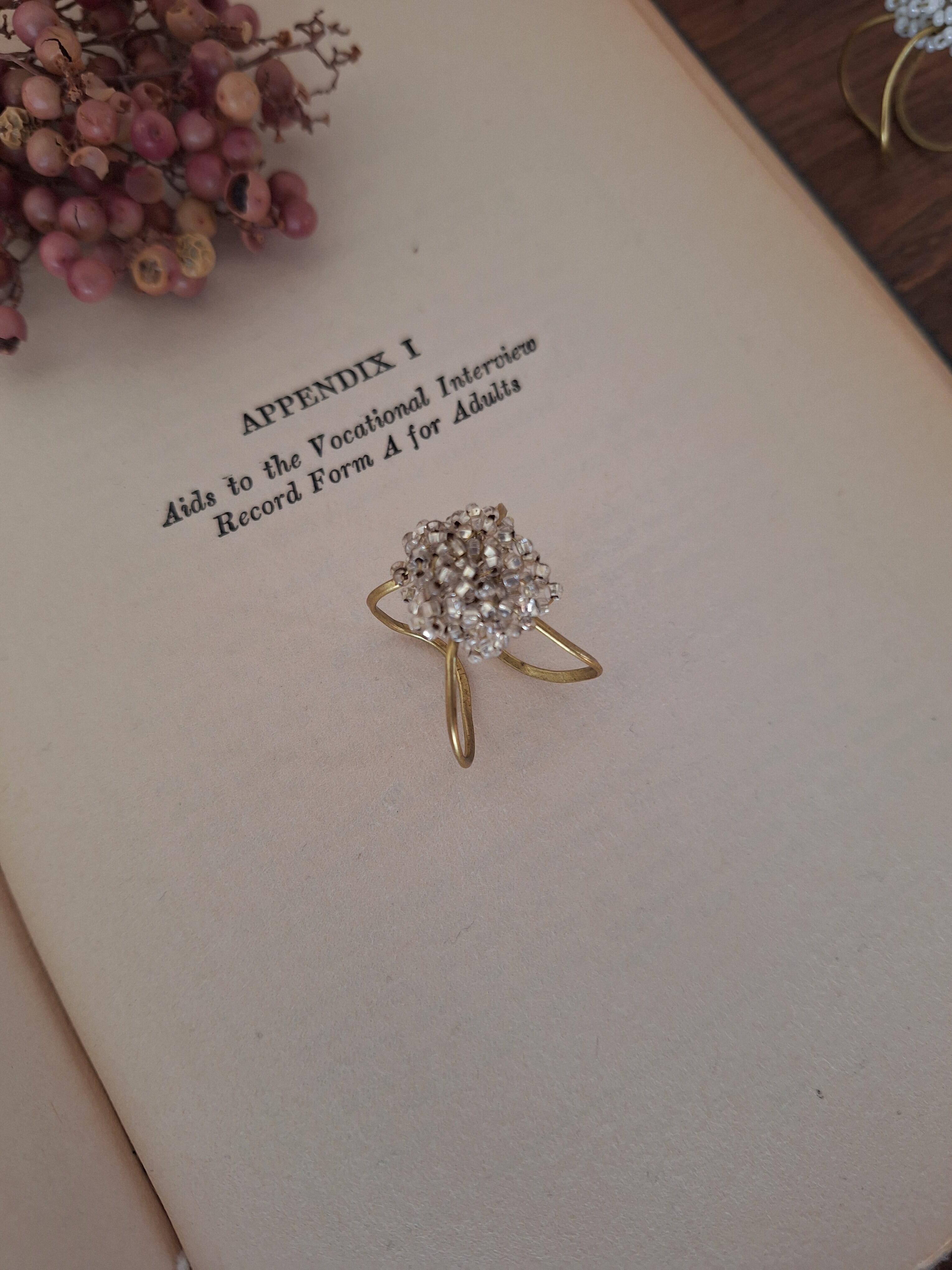 ヴィンテージビーズを真鍮ワイヤーで丁寧に編み込み、真上から見ると星のように輝くデザインに仕上げました。
