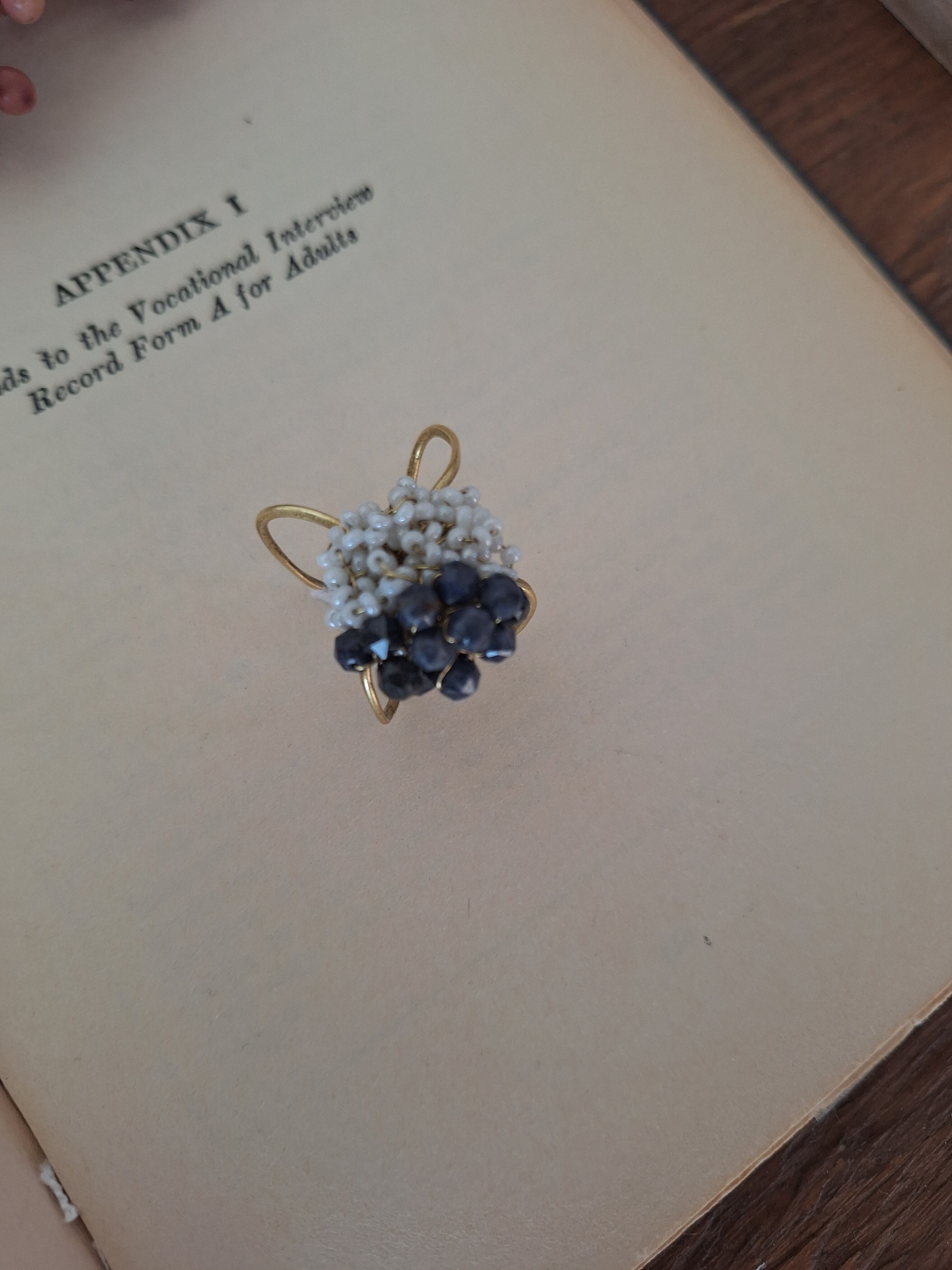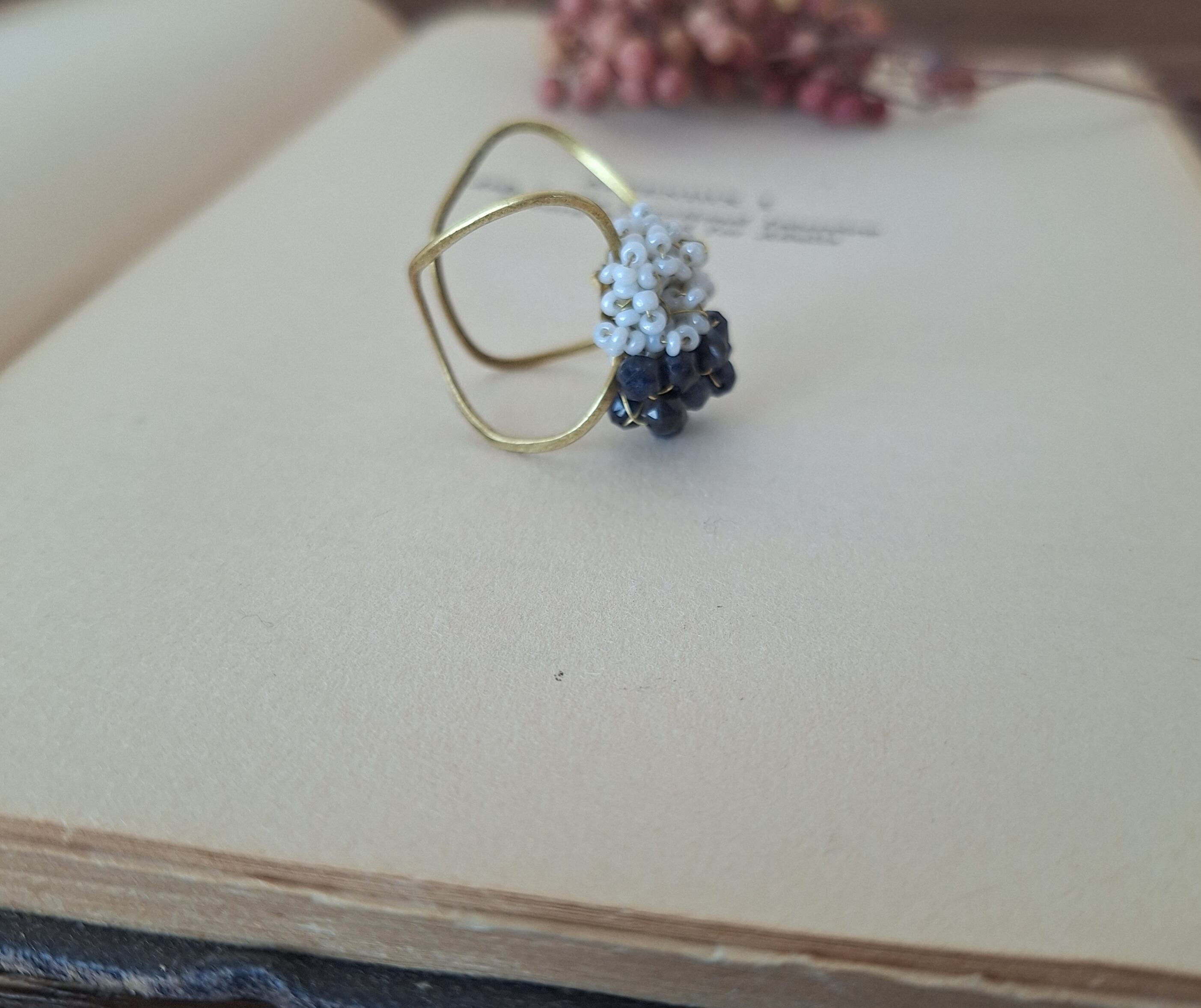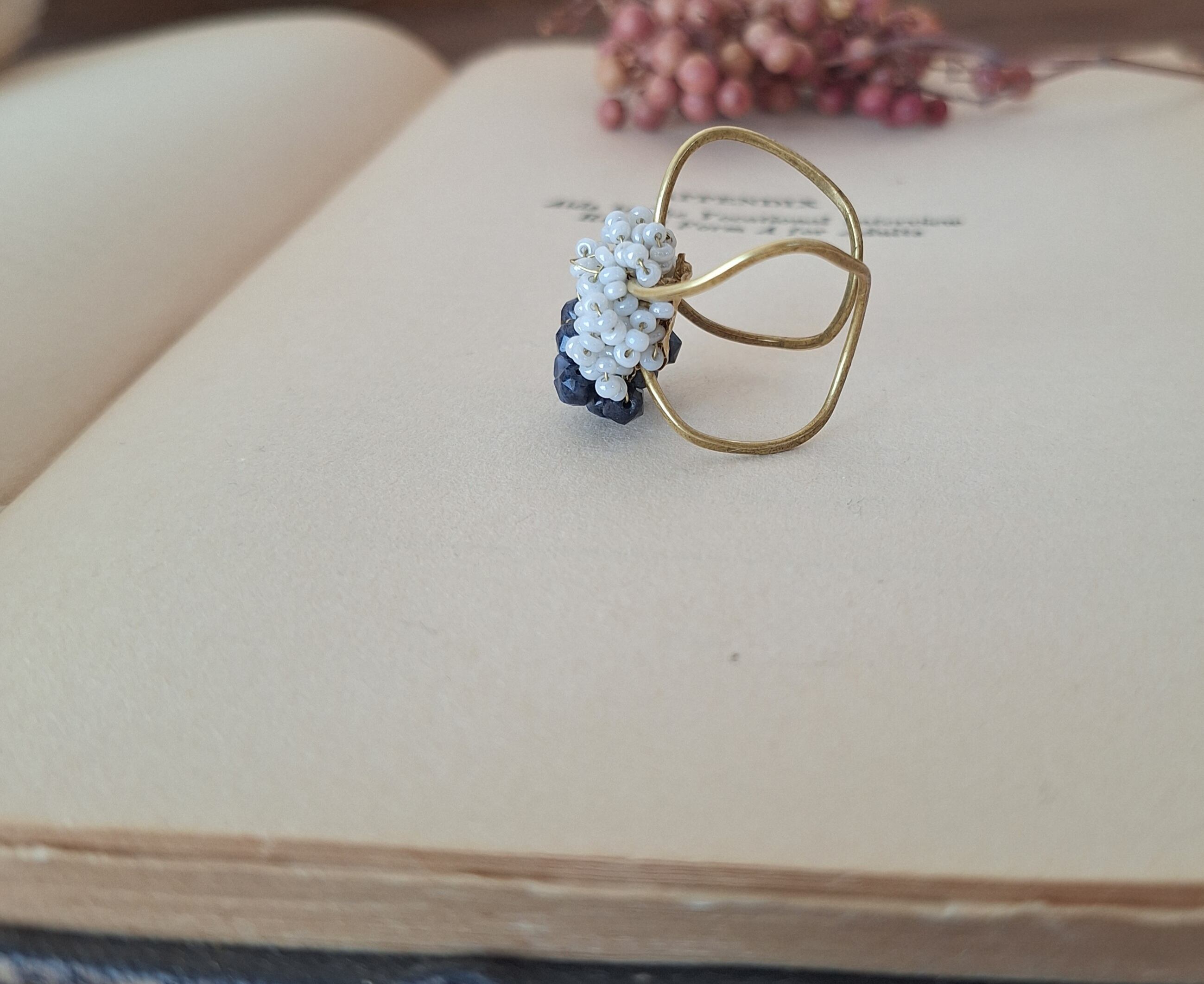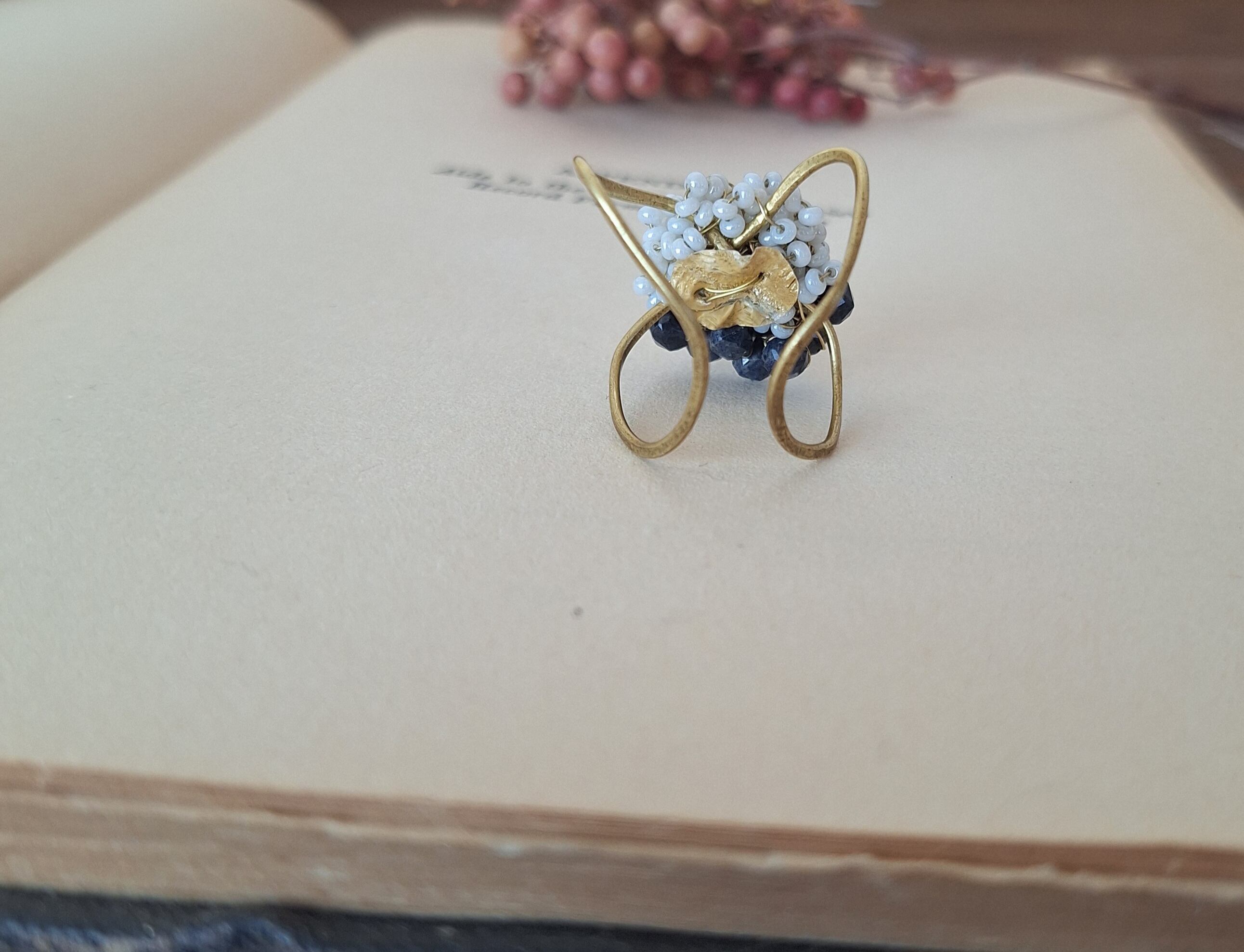 アンティークビーズの柔らかな煌めきと、9月の誕生石サファイアの深い群青色を合わせたイヤーカフ&リングです。