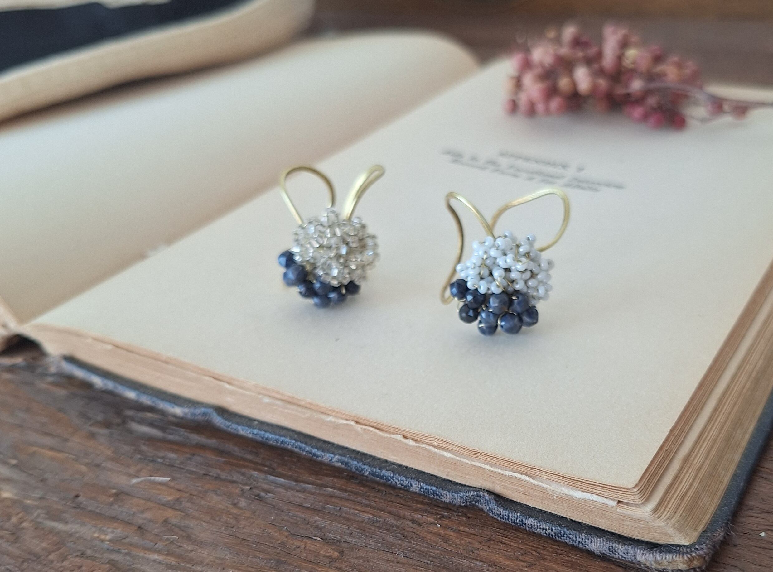 【素材】サファイア(天然石)、アンティークビーズ、真鍮ワイヤー 、スパンコール