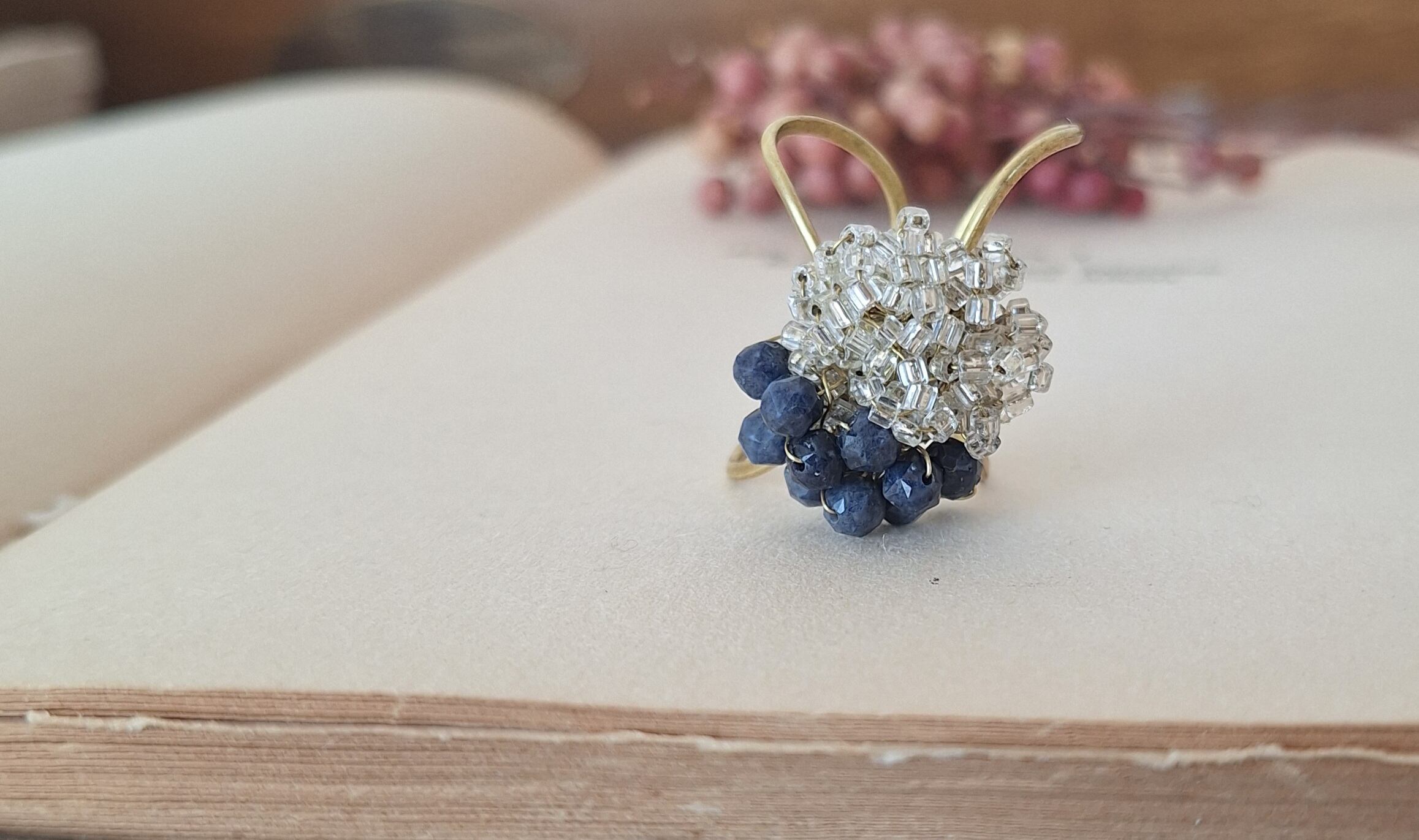 アンティークビーズの柔らかな煌めきと、9月の誕生石サファイアの深い群青色を合わせたイヤーカフ&リングです。