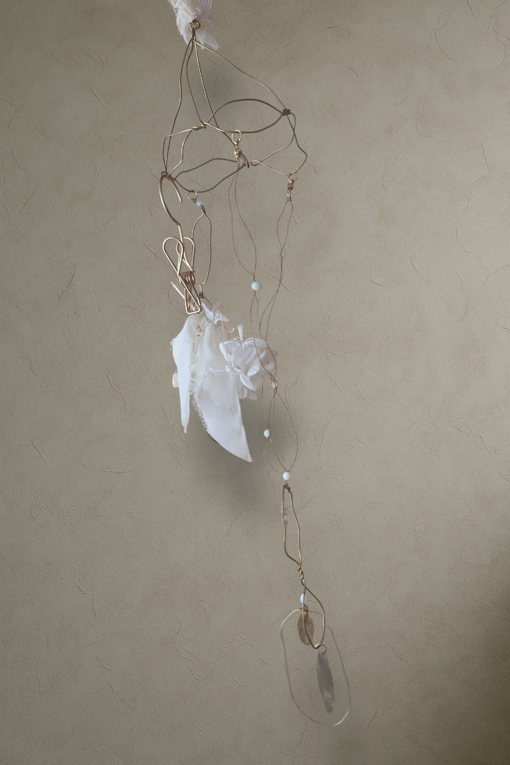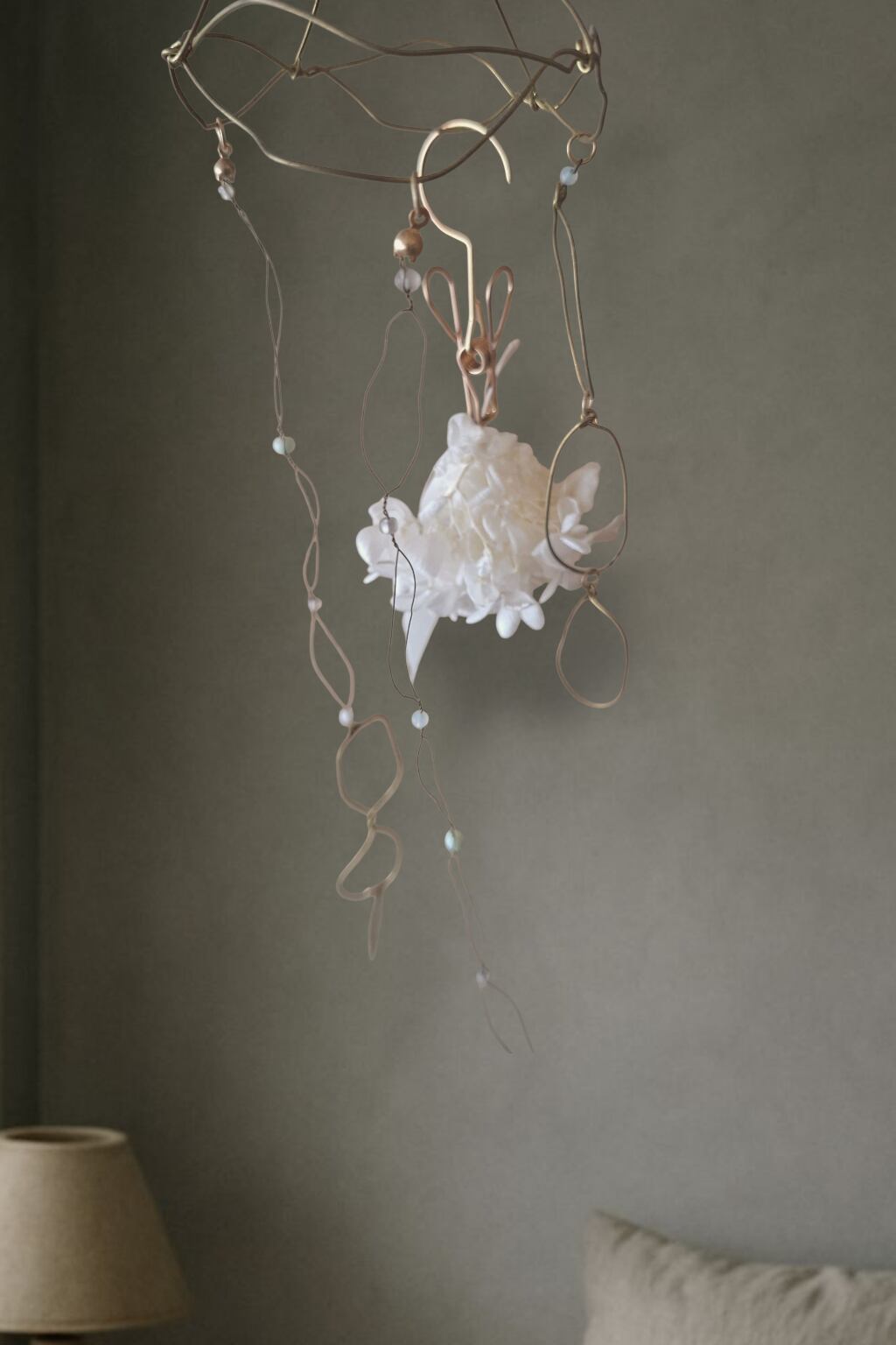 光が差し込む窓辺や、ランプの灯りのそばに吊るすと、ビーズやスパンコールが小さく輝き、壁や床に映る影までも楽しめます。