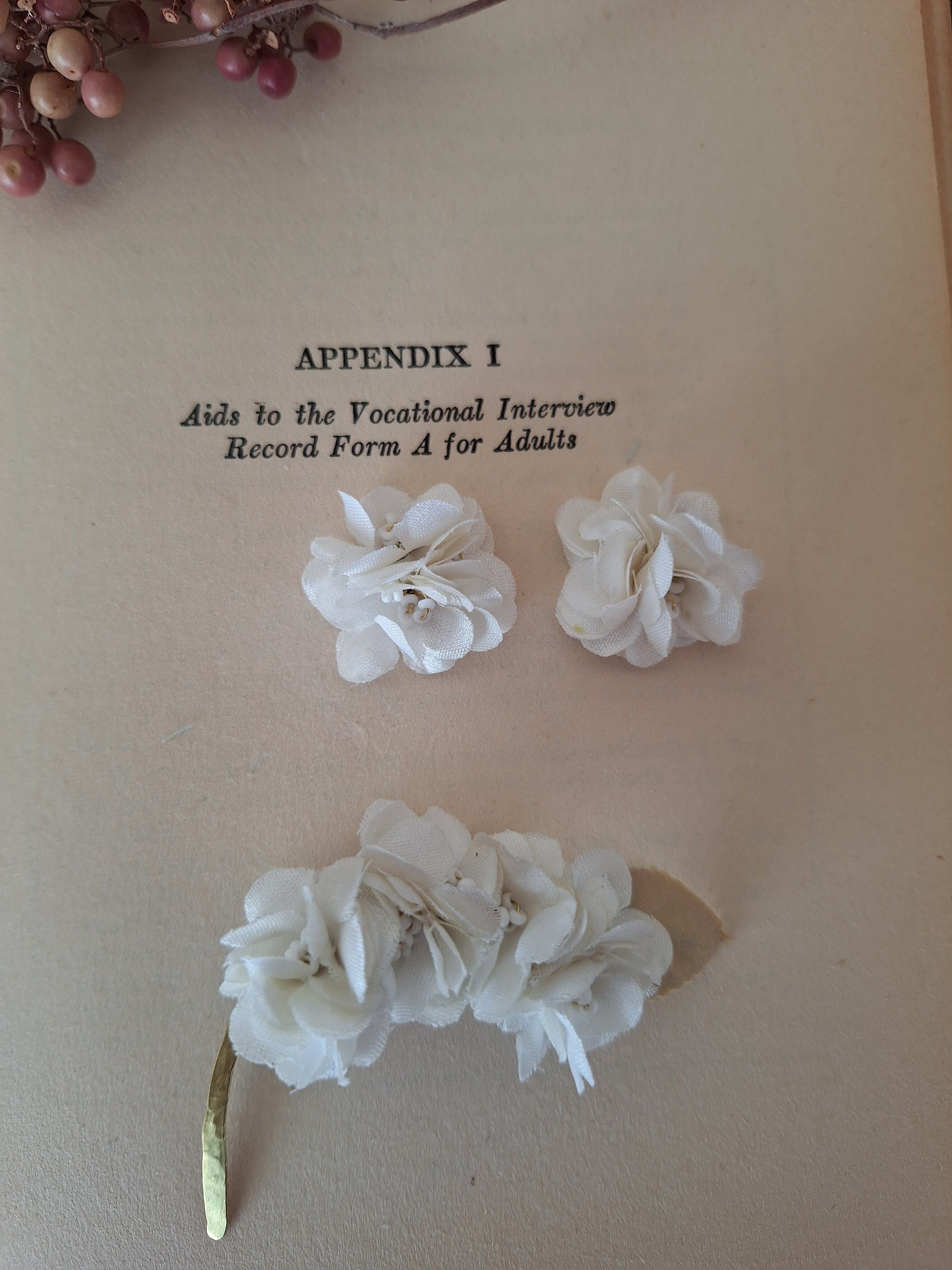 造花、ヴィンテージビーズ、真鍮ワイヤー、ブローチピン(3cm)、アンティークレース、リボン