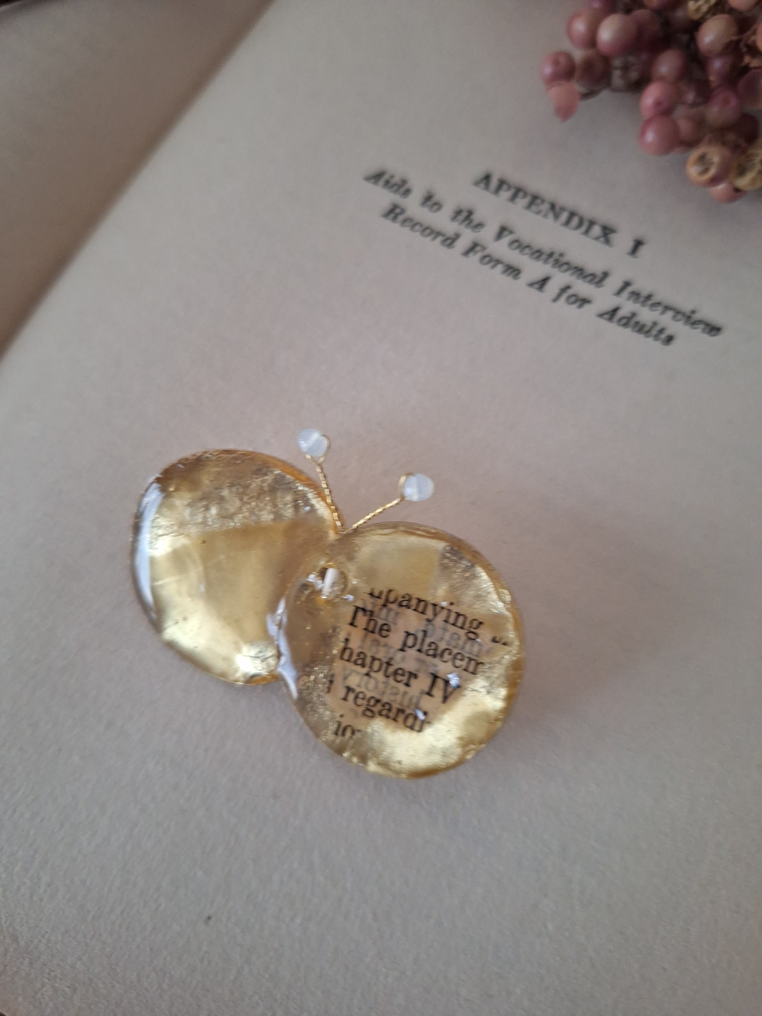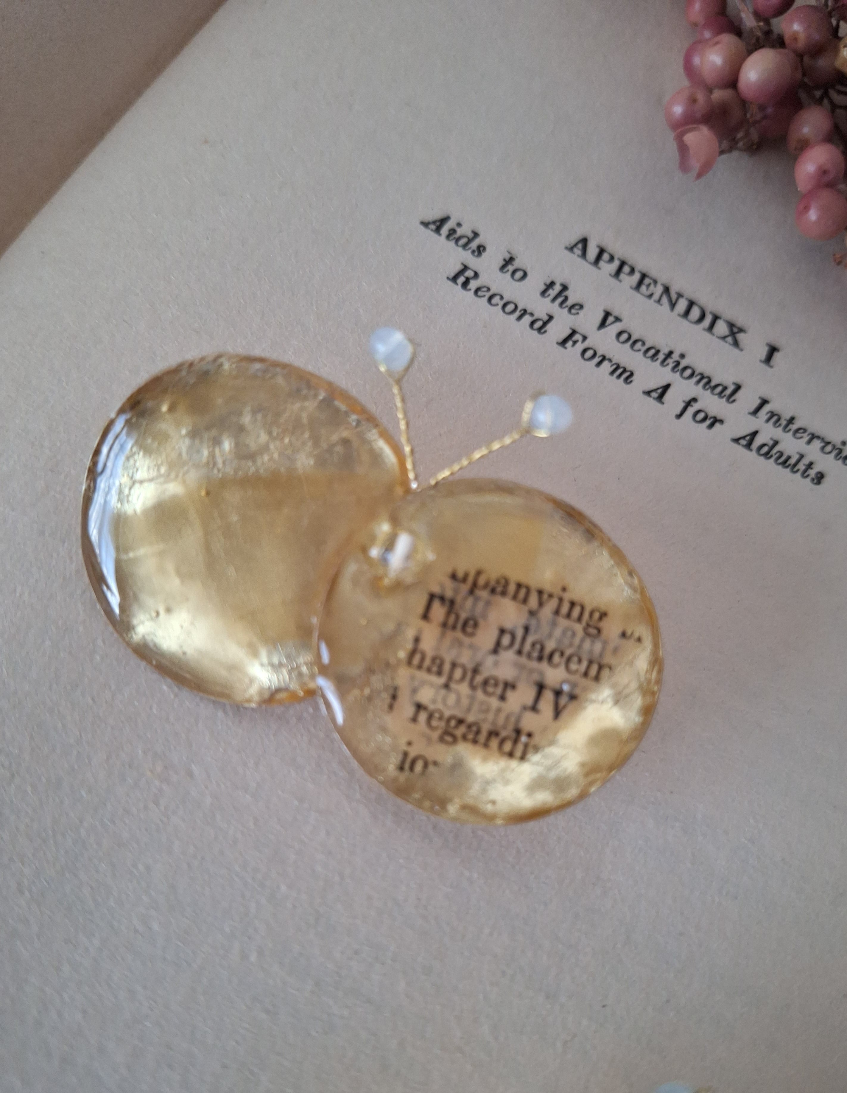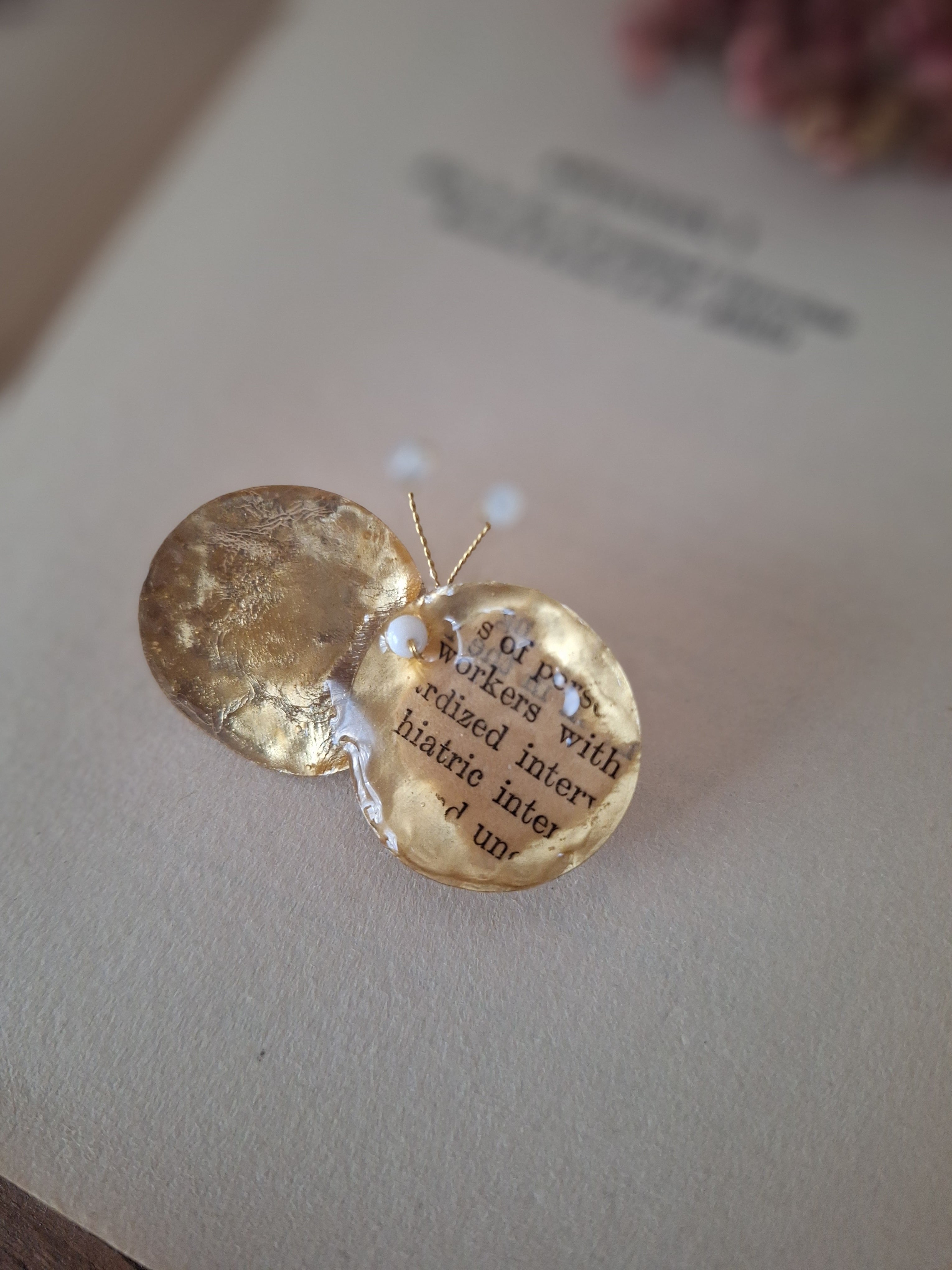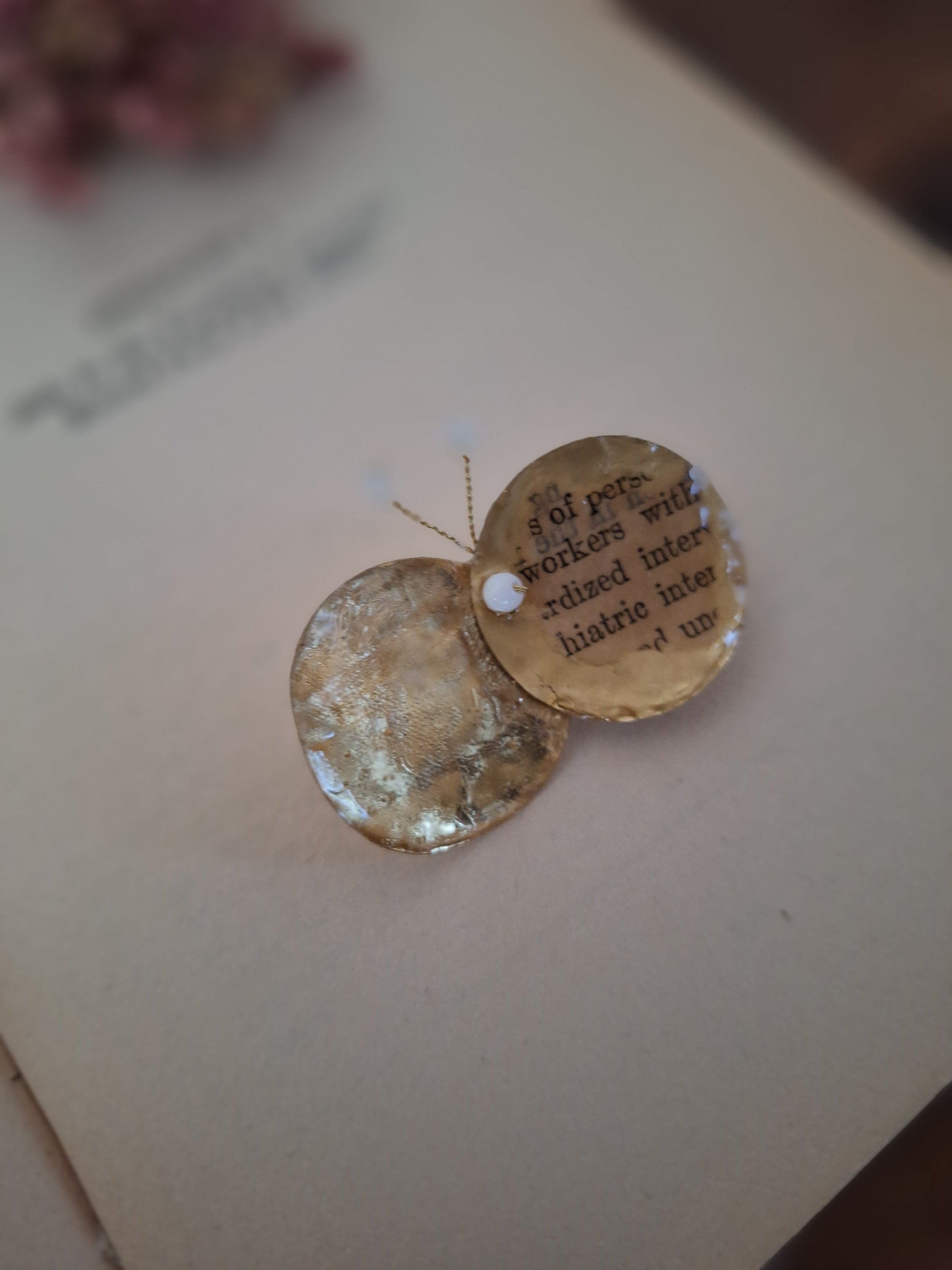 シークィン(スパンコール)、レジン、古書のかけら、ヴィンテージビーズ、真鍮ワイヤー、ブローチピン(3cm)