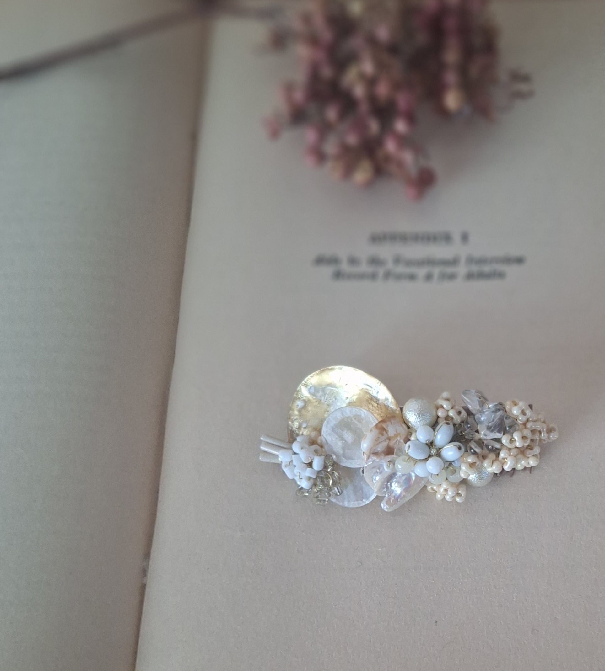白と透明のビーズは、月明かりに照らされた雫のようにきらりと輝き、柔らかな曲線がふわりと雲を思わせる静かなニュアンスを添えてくれます。