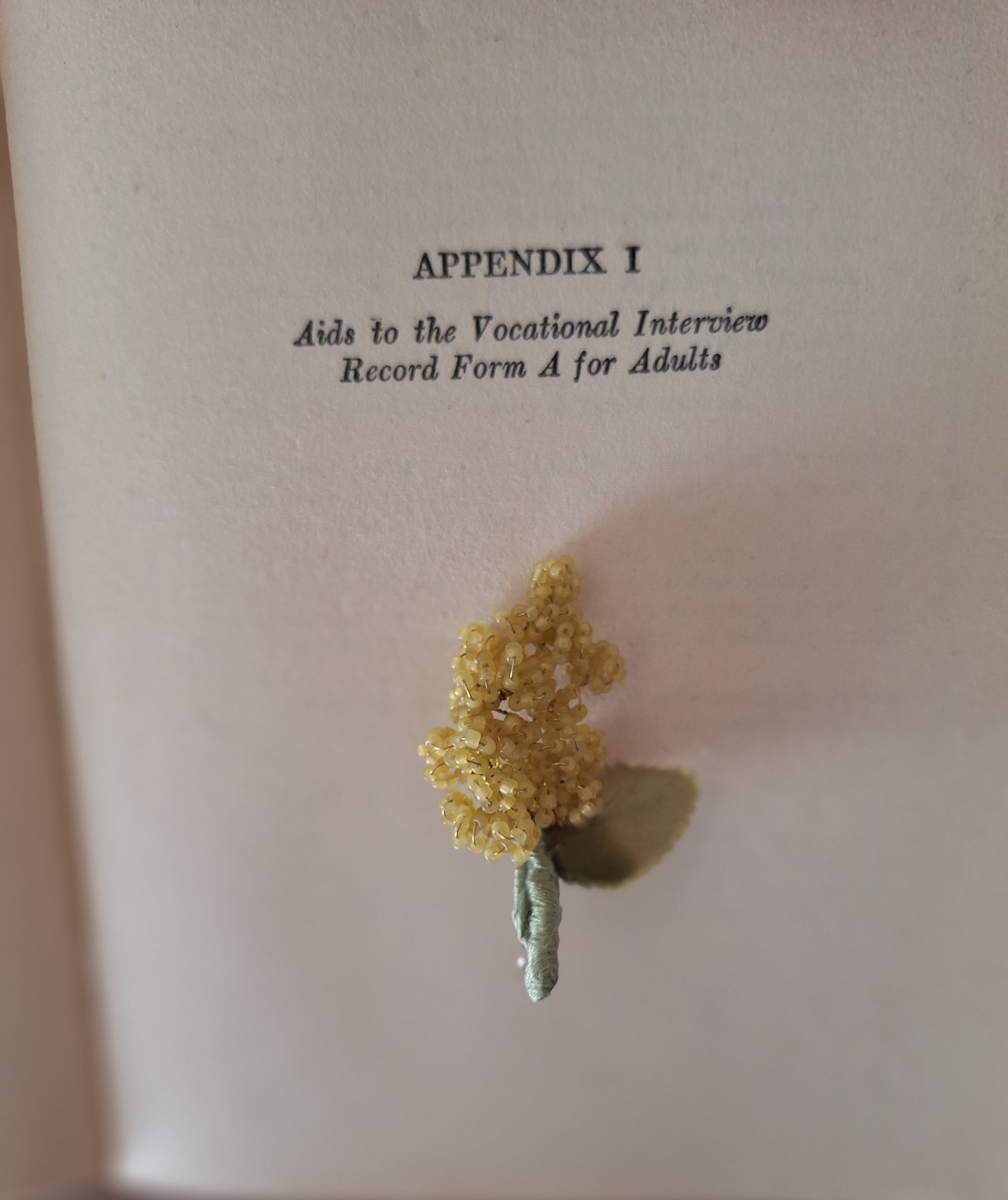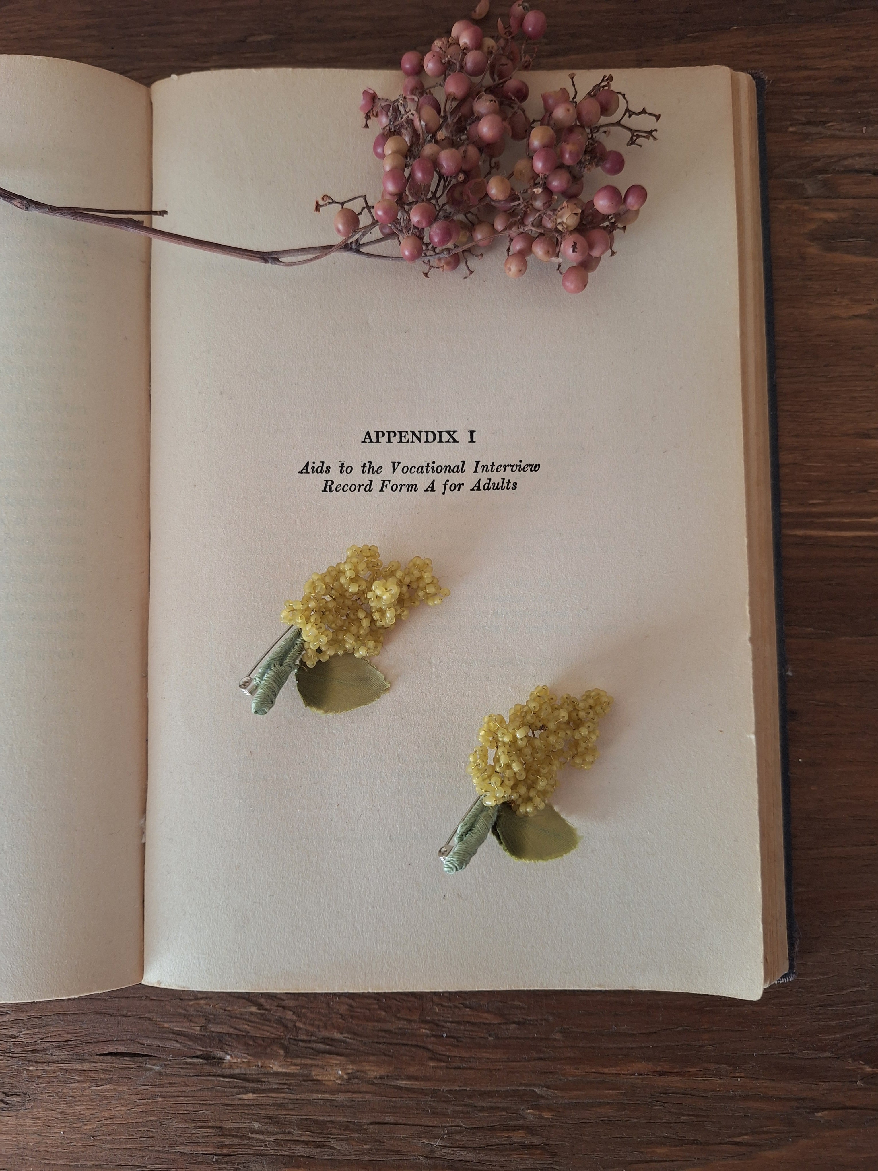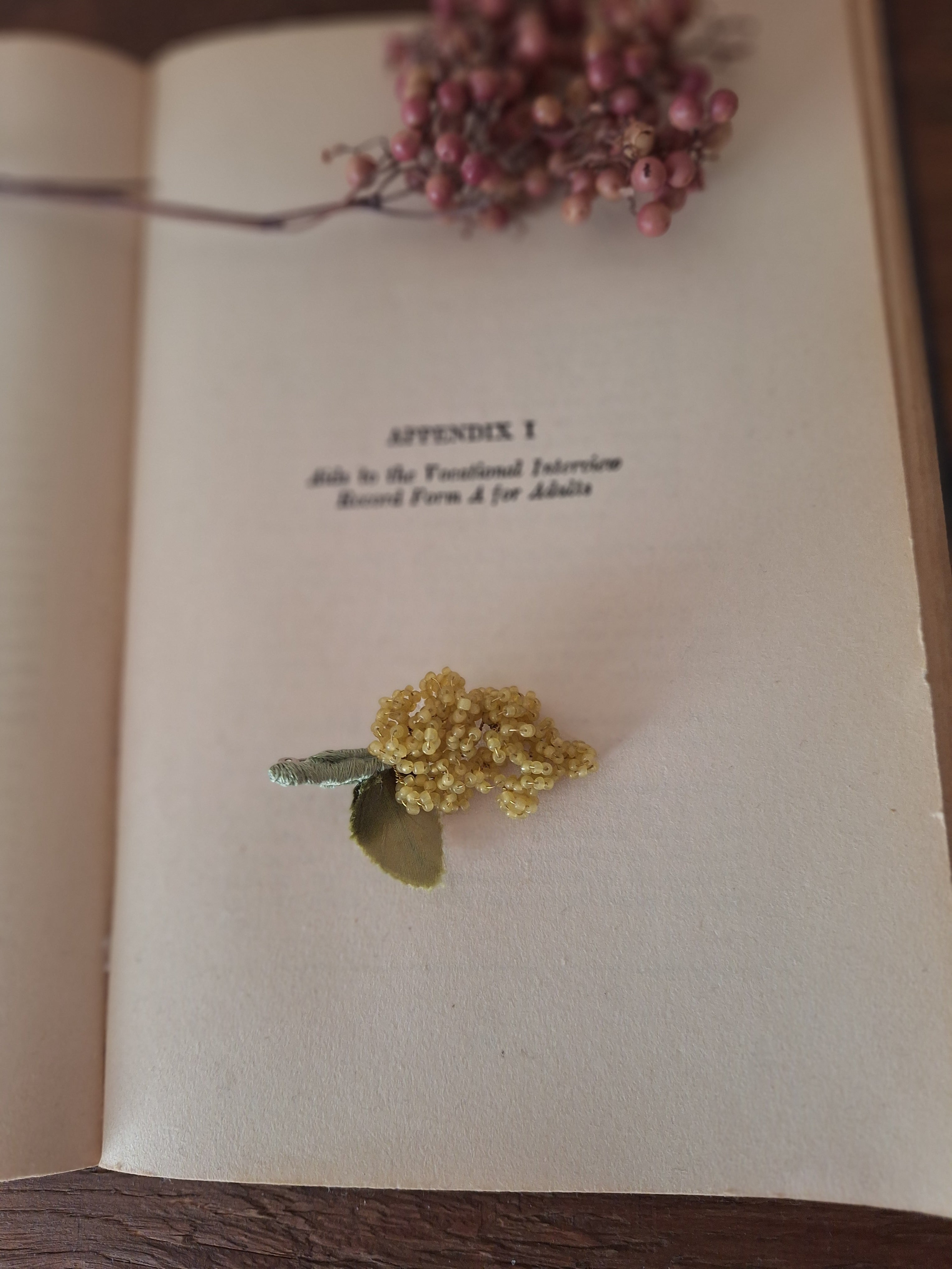 ヴィンテージビーズ、真鍮ワイヤー、ブローチ金具、刺繍糸