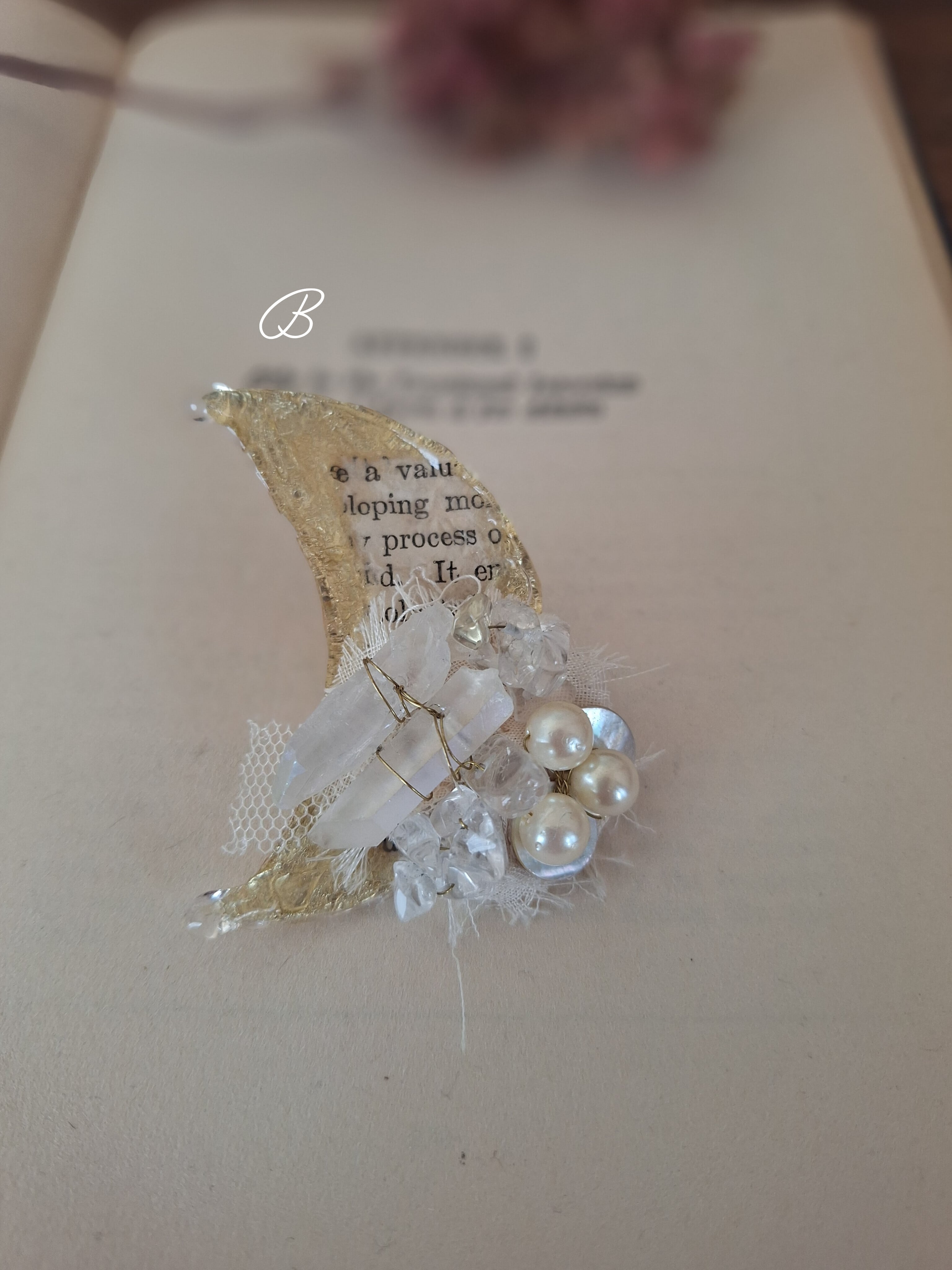 B.水晶、樹脂パール、シェル、真鍮ワイヤー、レース、古書紙片、レジン、シークイン(スパンコール)