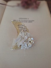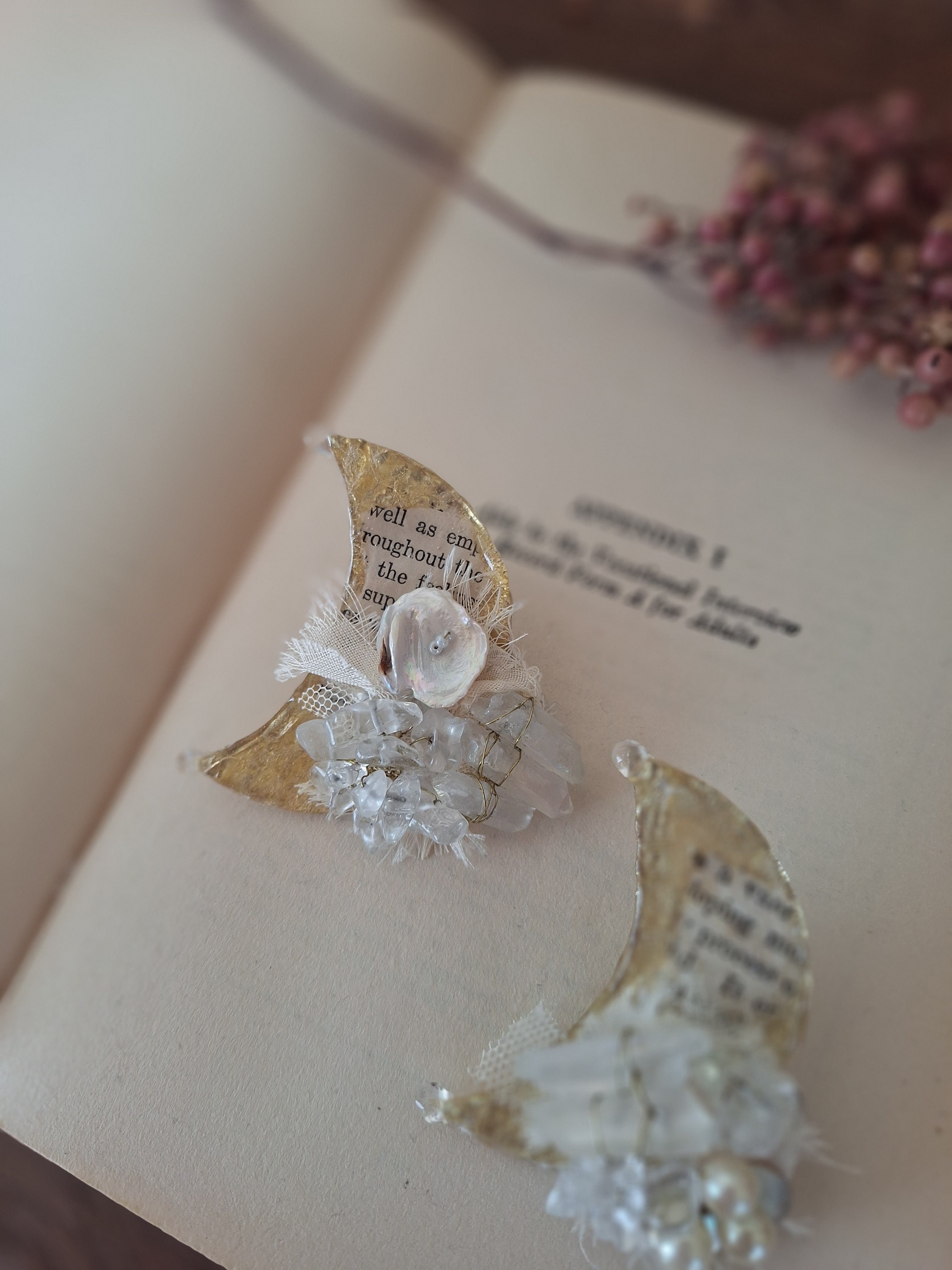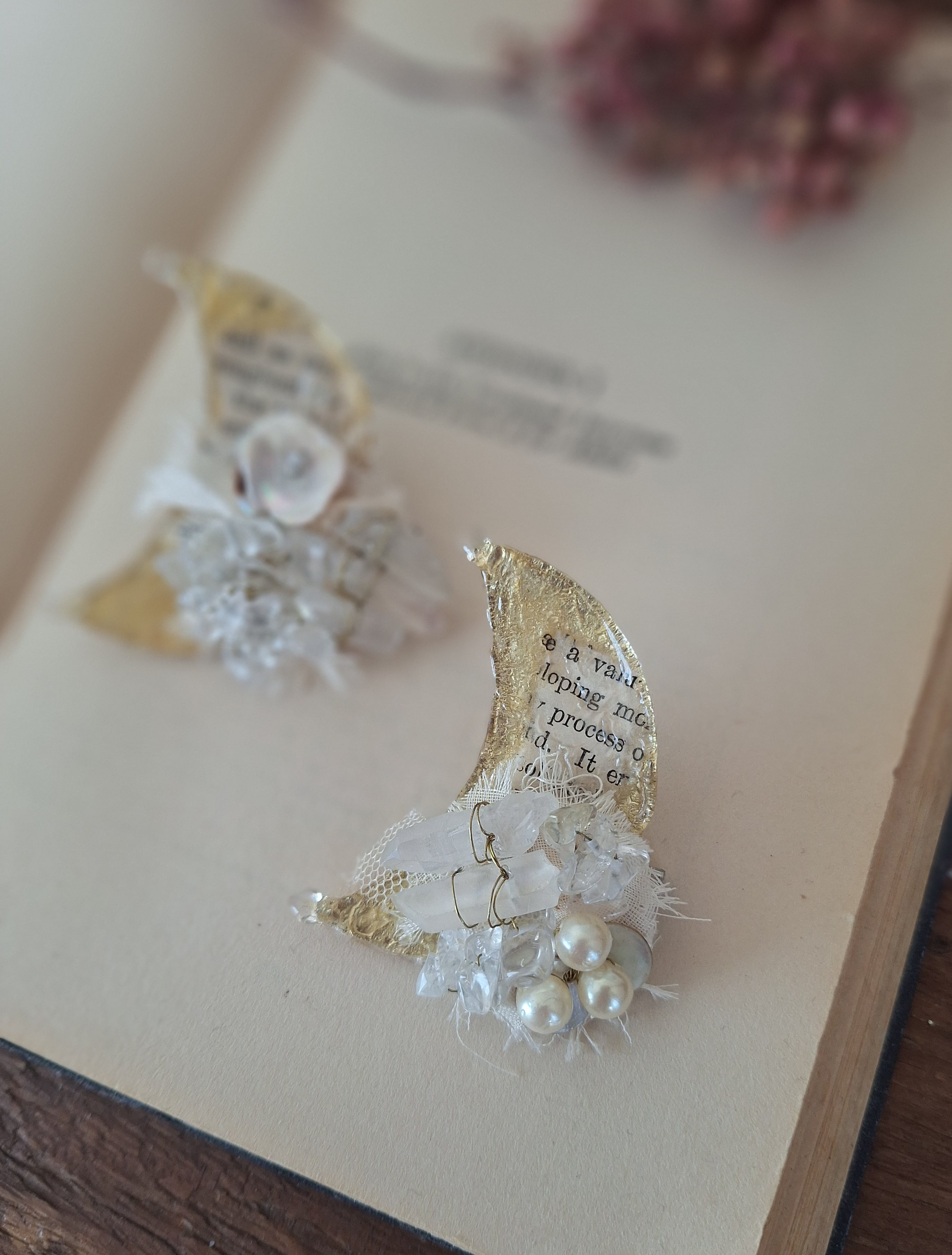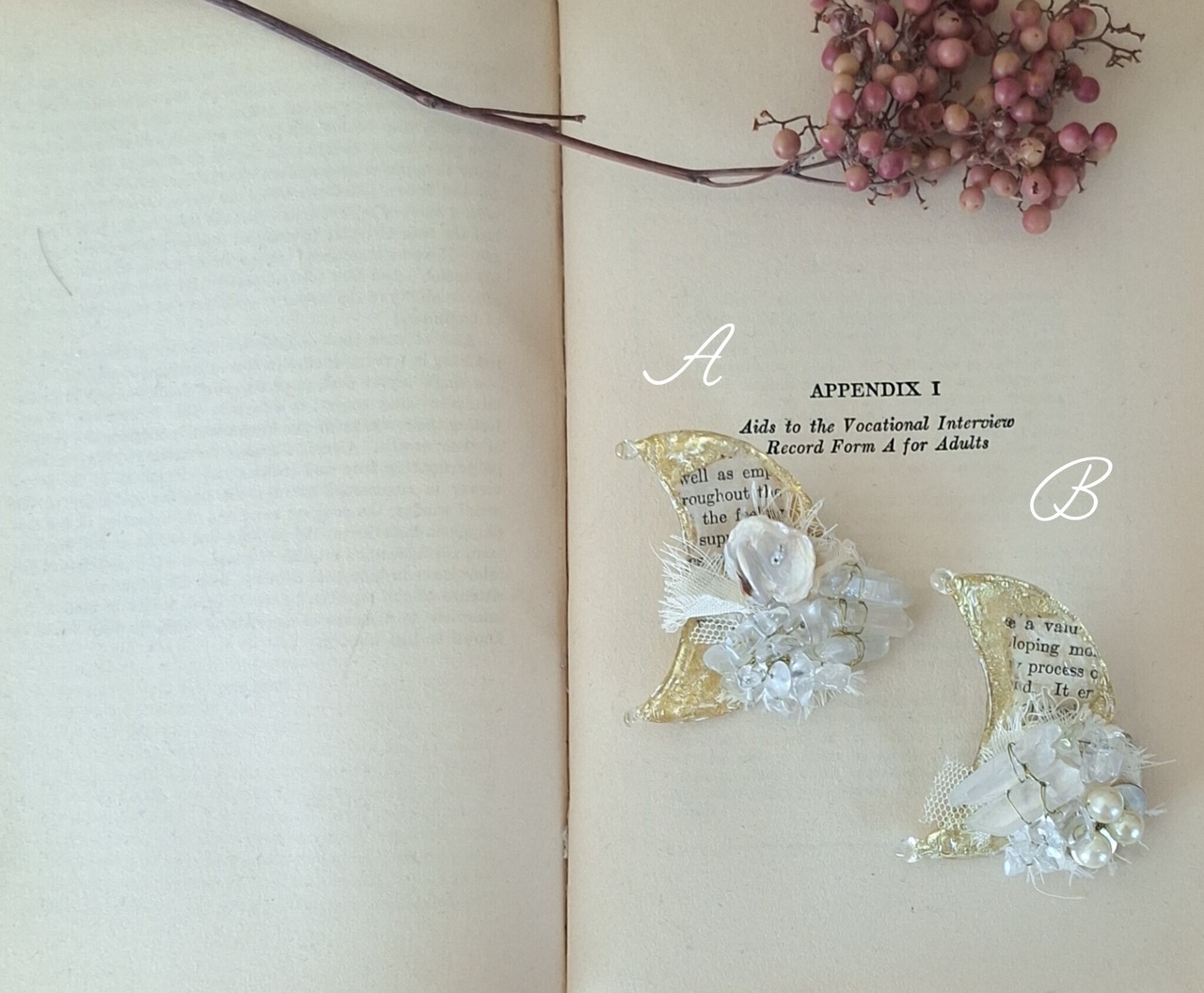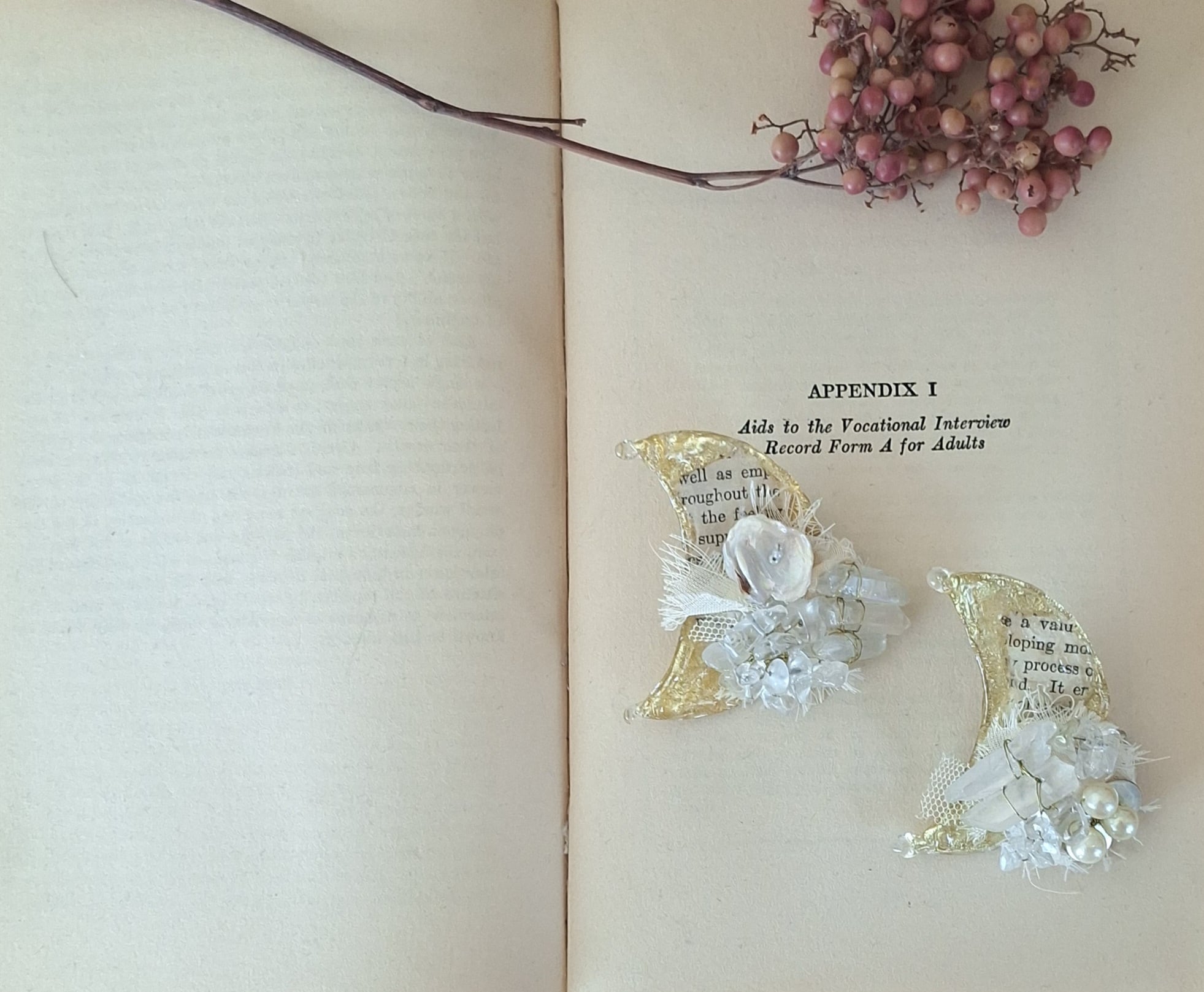 【素材】A.ケシパール、水晶、ヴィンテージビーズ、レース、古書紙片、真鍮ワイヤー、レジン、シークイン(スパンコール)