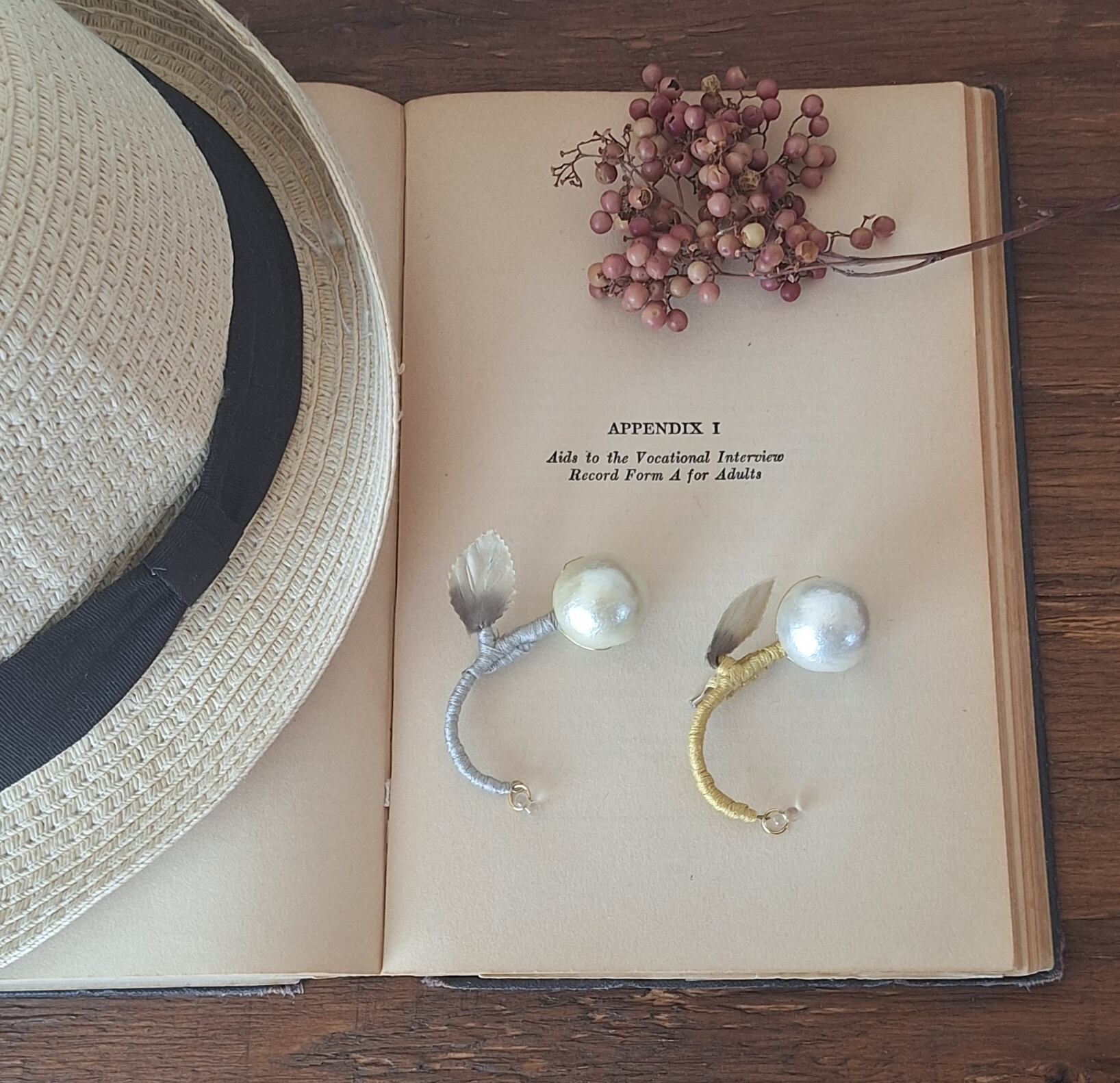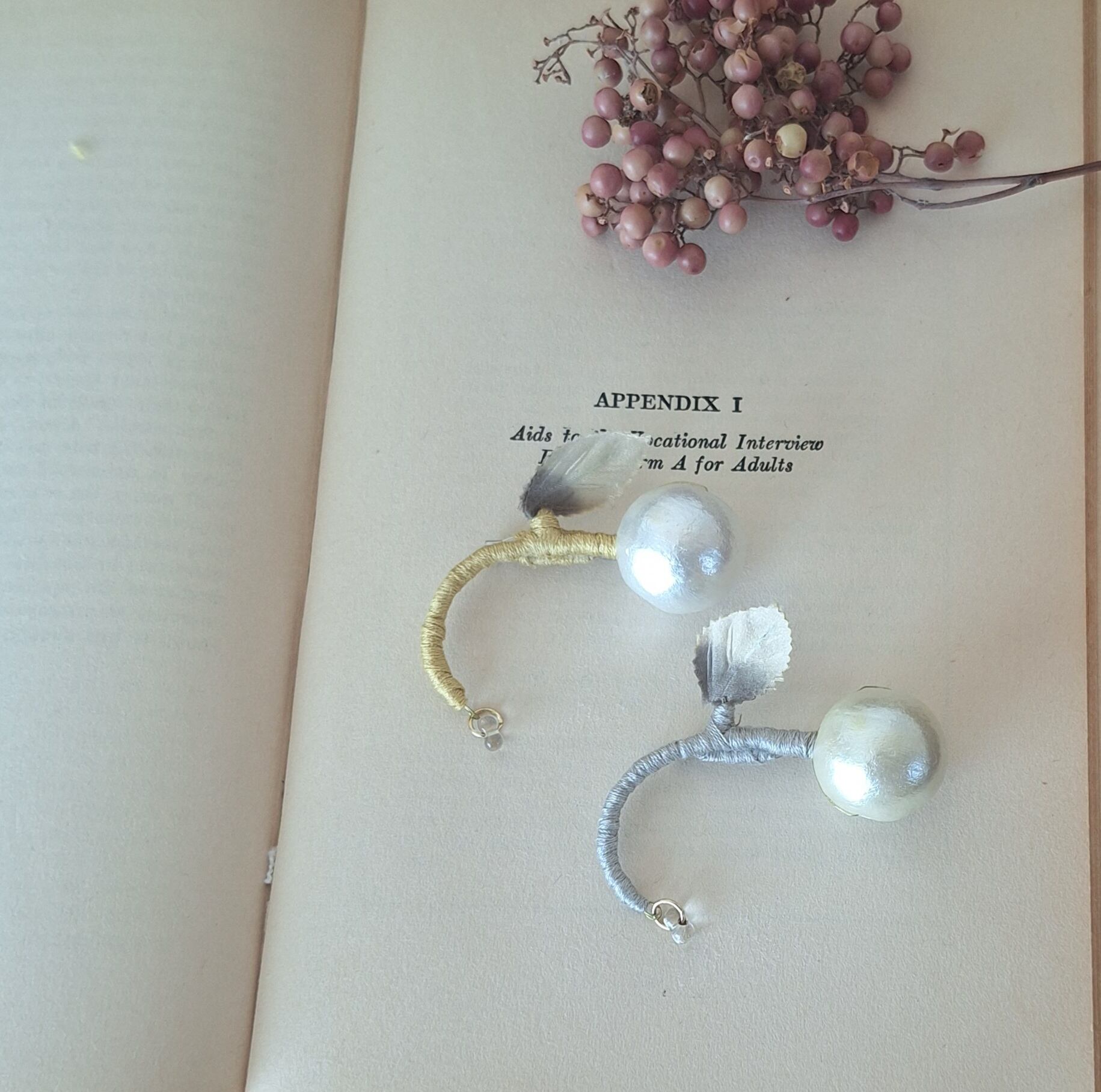 □素材□ コットンパール(きなり)、真鍮ワイヤー、刺繍、造花、ガラスビーズ、メタルパーツ、ブローチパーツ