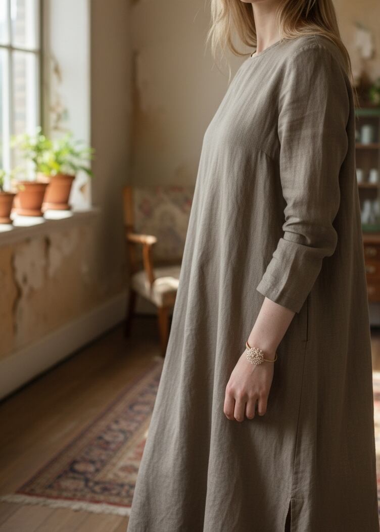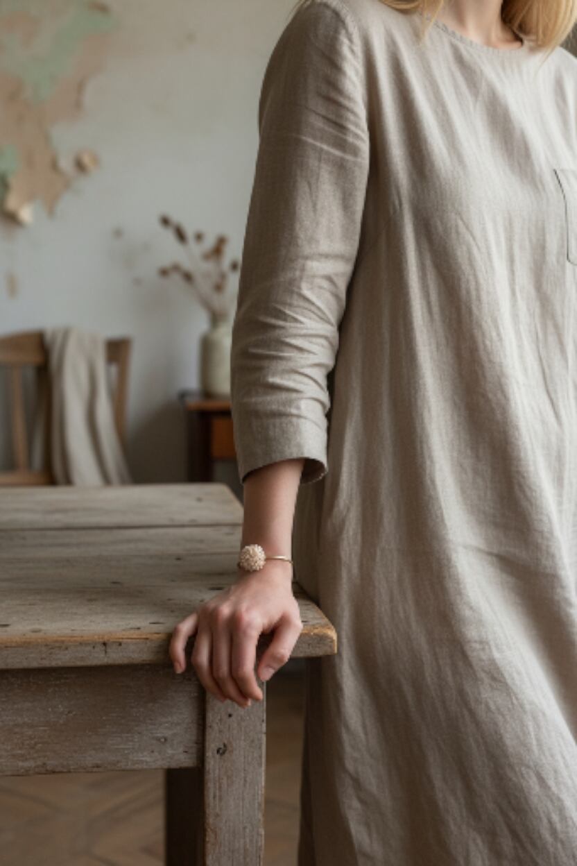 アンティーク調の真鍮バングルとホワイトパールの組み合わせは、クラシカルで上品な雰囲気を引き立てます。