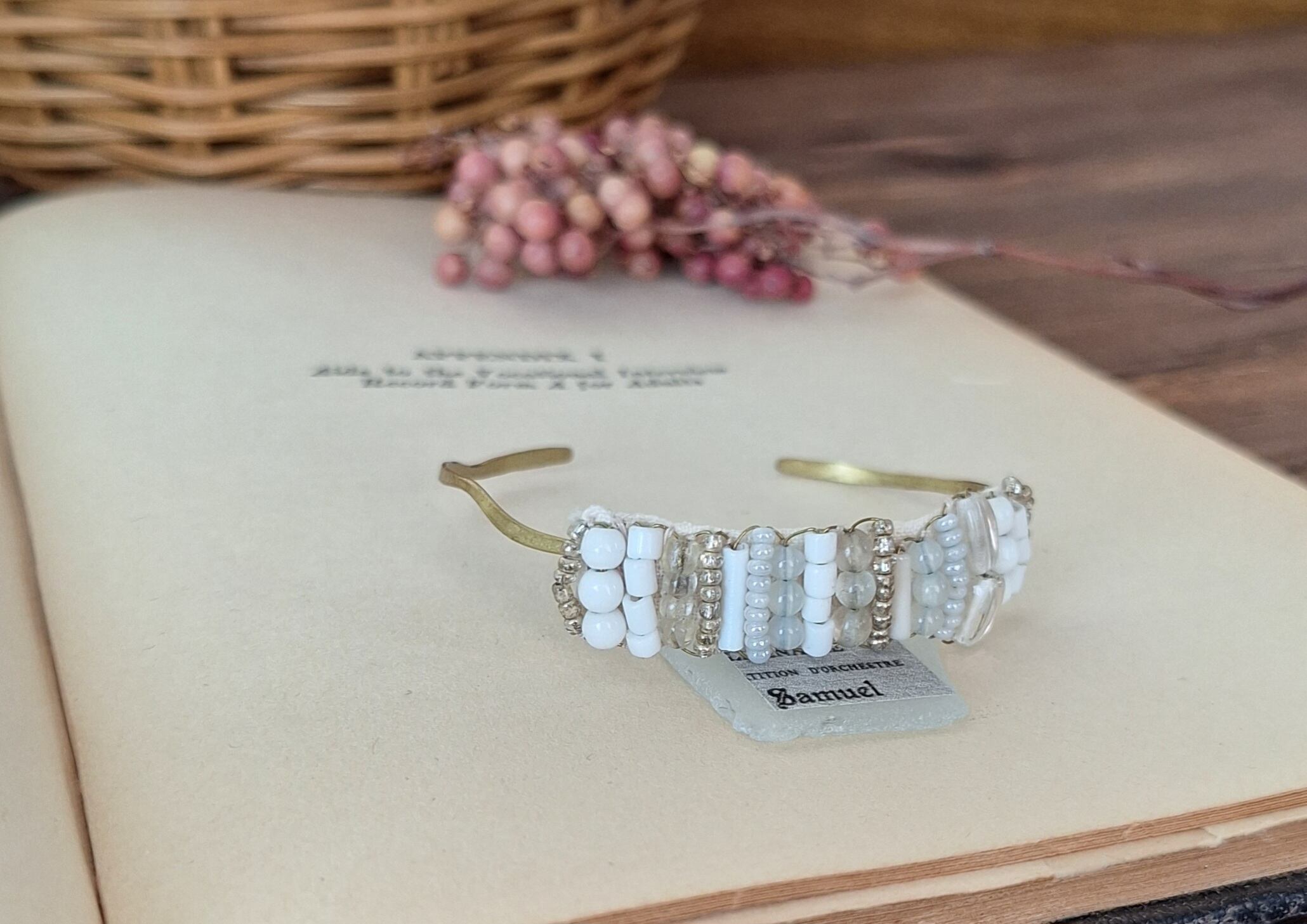 ヴィンテージビーズ、ガラス、パールをミックスして仕立てた一点もののバングルです。