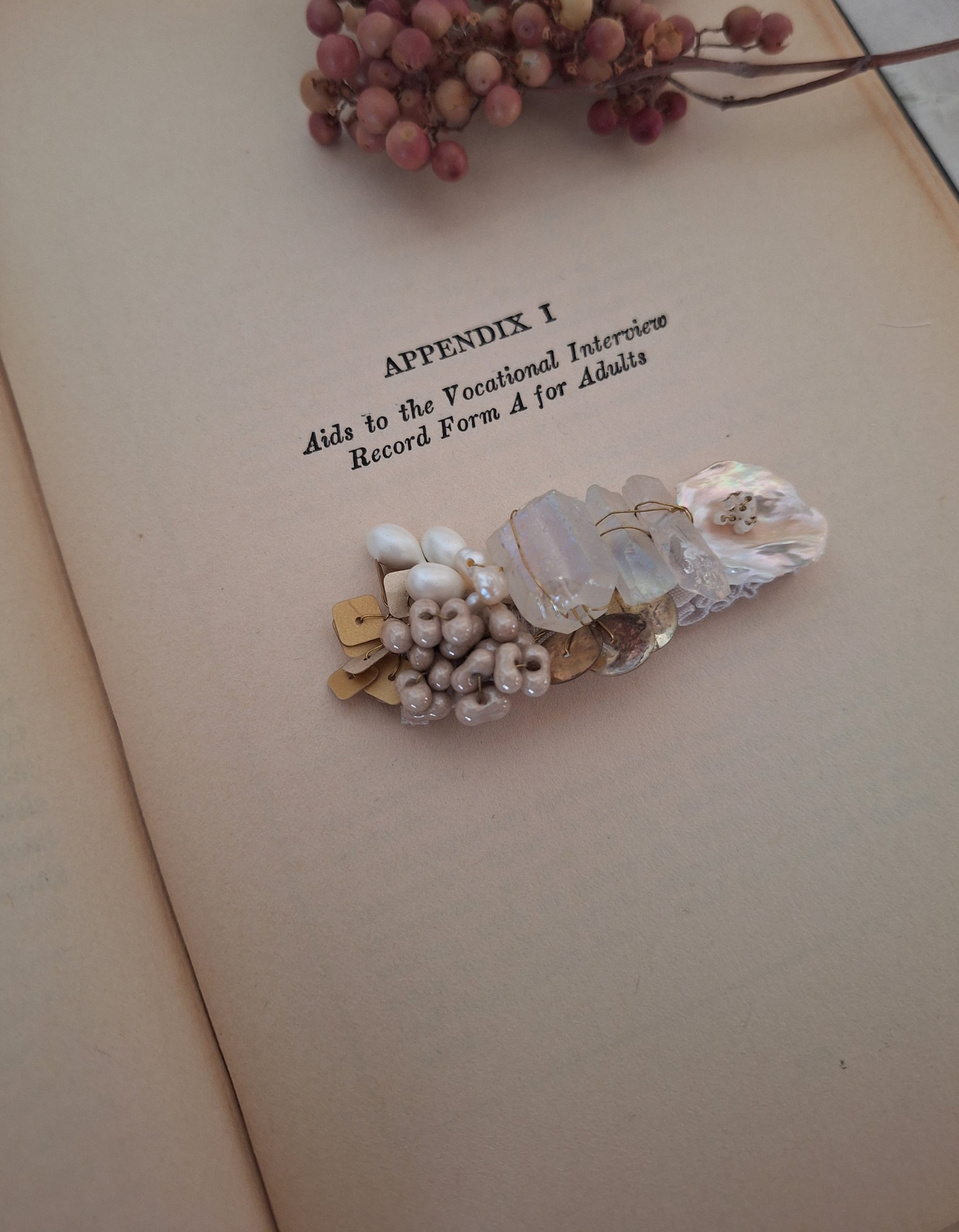 真鍮をベースに、水晶、ヴィンテージビーズ、アンティークスパンコール、ガラスパーツをひとつひとつ丁寧にコラージュしました。